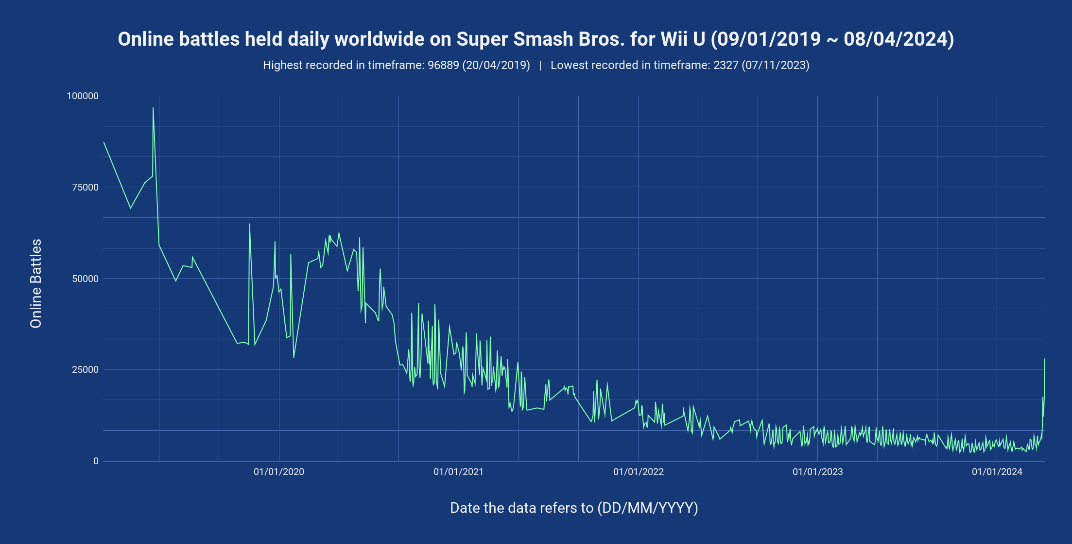 Super Smash Bros. for Wii U fans, I bring you a chart detailing the activity of battles across 5 years (2019 ~ 2024), right up until the closure of the online services. The line returns to a high right at the end that hasn’t been seen since 2021! Thank you all for playing!