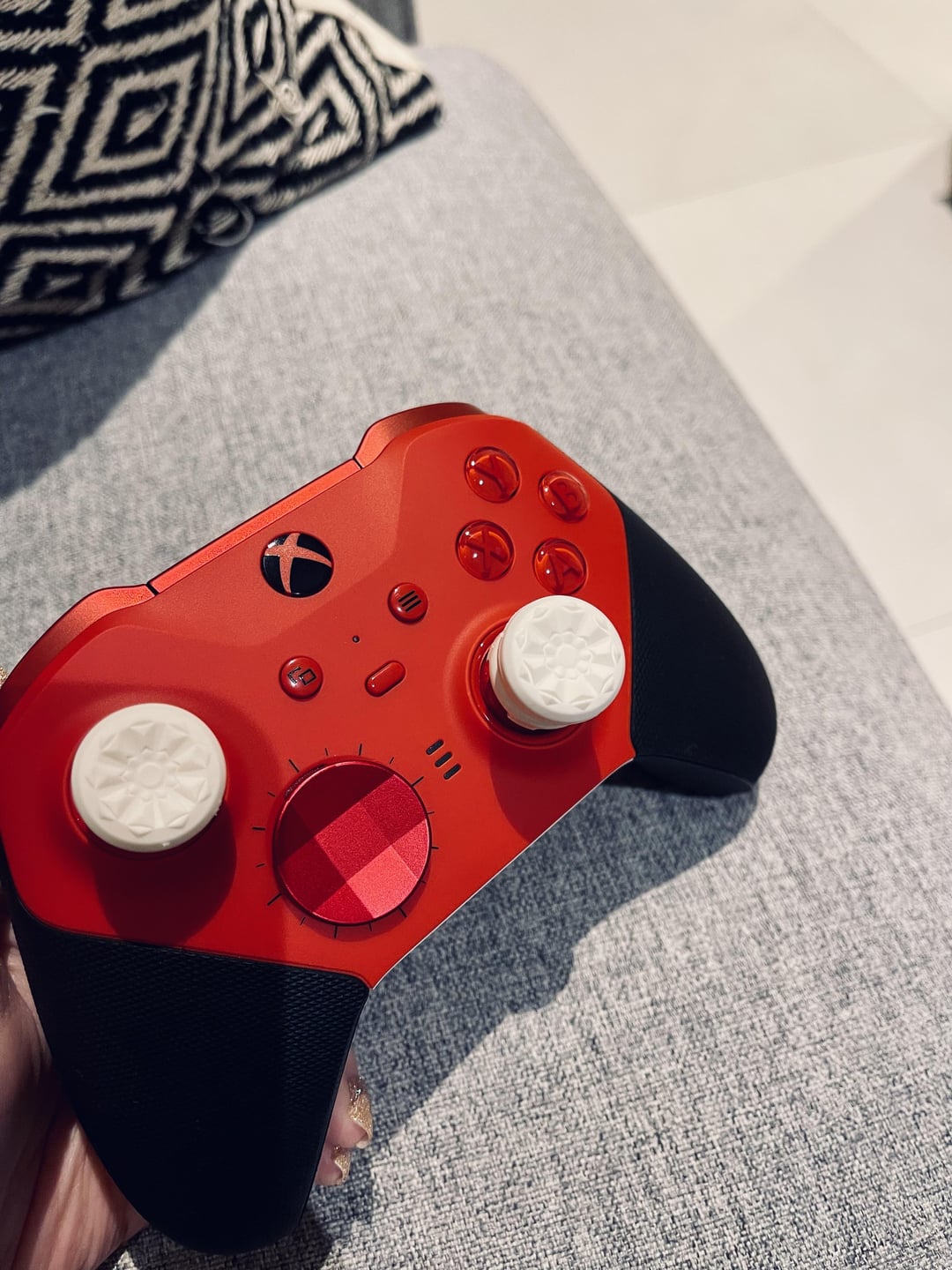 I changed from the standard Elite Series 2 Black…. Long story short … my Black Elite stopped working and didn’t have any actionable sticks or buttons working, the store where i bought it (Mediamarkt) was kind enough to refund all of the controller 2 years after i bought it. They didn’t have the black one available, or i could not replace it with the one that i had, so i went colors!!…. And got a Red one, .. i put some Gold paddle back and .. i dont know why i add some KontrolFreeks… all with the money that i got from the refund.