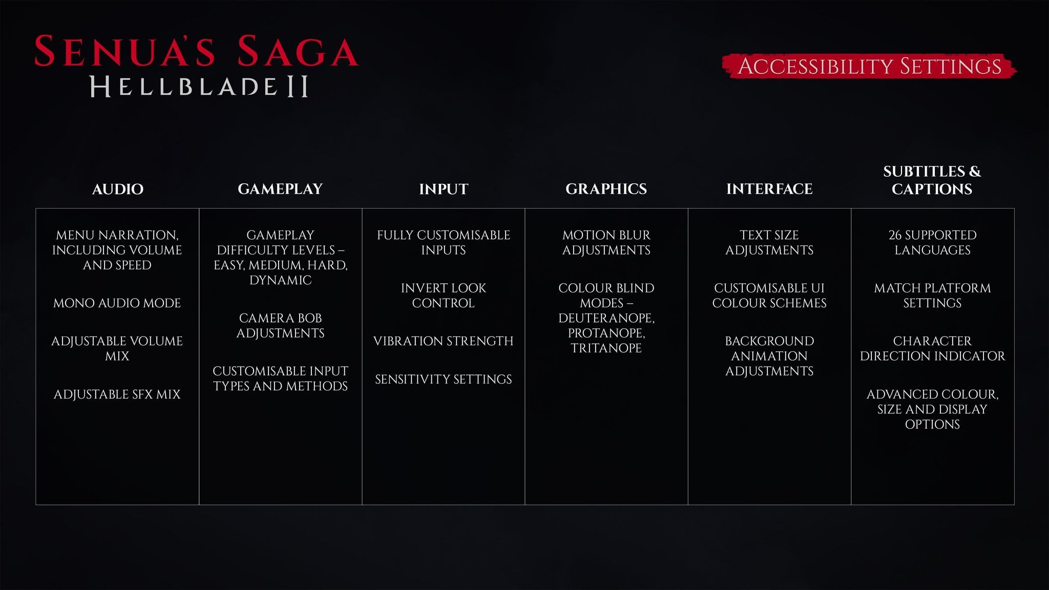 Overview of the accessibility settings available in Senua’s Saga: Hellblade II Posted by YouthIsBlind