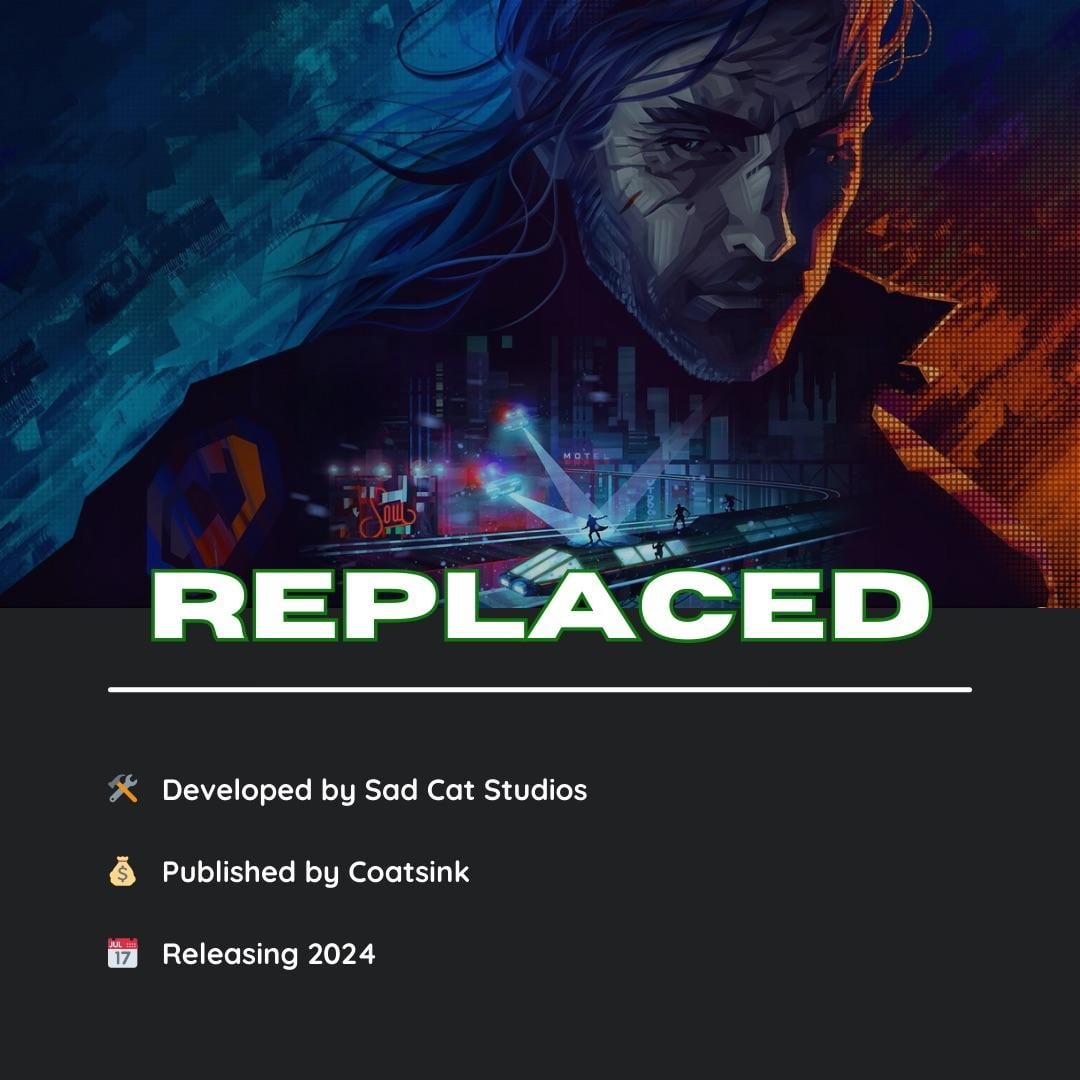 Replaced – In August of last year, Sad Cat Studios announced via Steam that Replaced was being delayed to the latter half of 2024. Hopefully it's worth the wait, as the pixel art platformer looks absolutely stunning. Clearly inspired by classic cyberpunk staples such as Blade Runner, the game has you play as an artifical intelligence that has been forcibly implanted into a human body. All the while set to the backdrop of a gorgeous neon-soaked alternative take on the 1980's. Coming to Xbox Series X|S, Xbox One and PC. The game will be available day one in Game Pass. [Trailer]