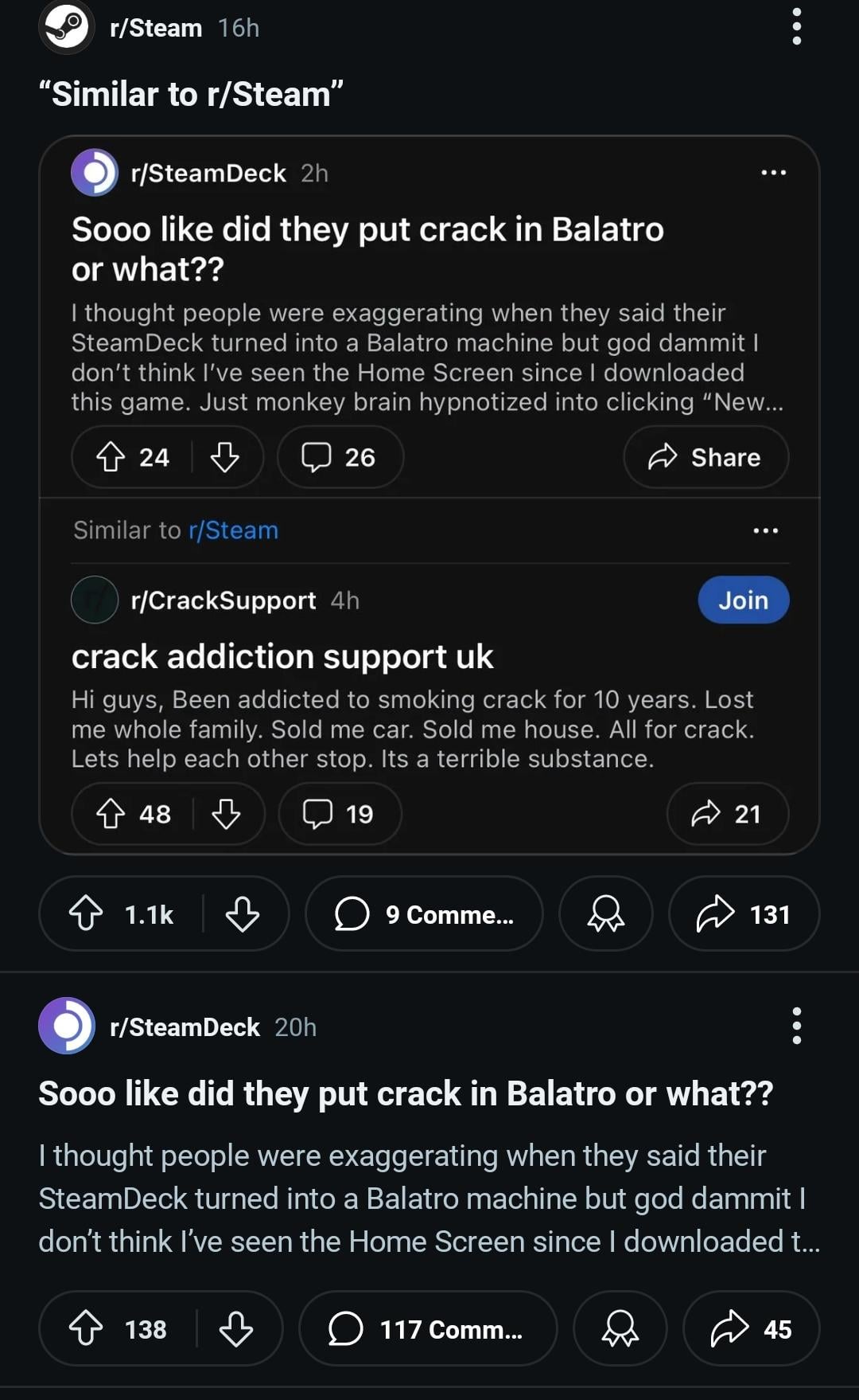 whydidineedanewacc on June 14, 2024 1:54 pm Also yes. Just checked Balatro is 85% crack. 5% poker and 10% rogue ish Somehow my reading also showed that you loose more time to Balatro than sleep.