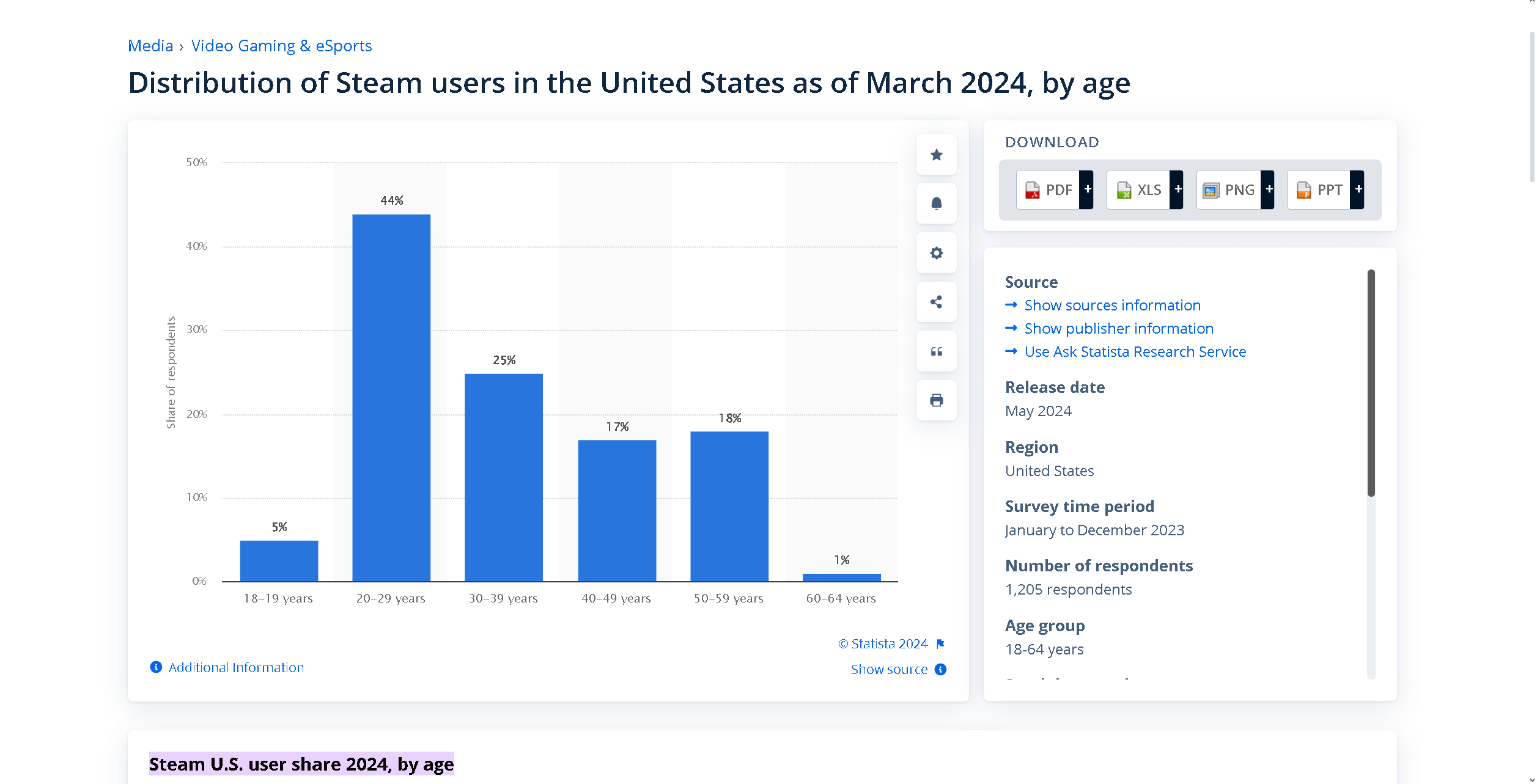Average age of Steam users (2024) | “As of March 2024, some 44 percent of adult Steam users in the U.S. were 20 to 29 years old. The survey was conducted in 2024, among 1,205 respondents.” -Statistica