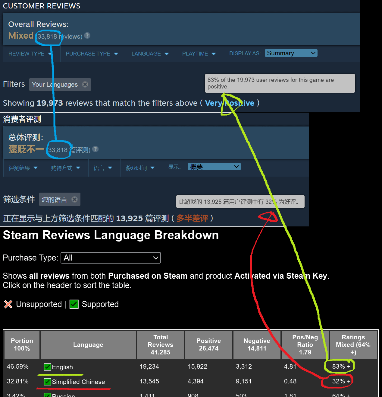 32.8% (13545) of 41285 reviews are Simplified Chinese, 9151 out of 13545 are negative results in a 32% rating.
