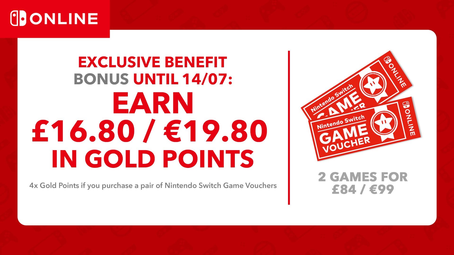 [Nintendo of Europe] Nintendo Switch Online members! You can earn £16.80 / €19.80 in Gold Points when you buy a pair of Nintendo Switch Game Vouchers. Offer ends July 14th!