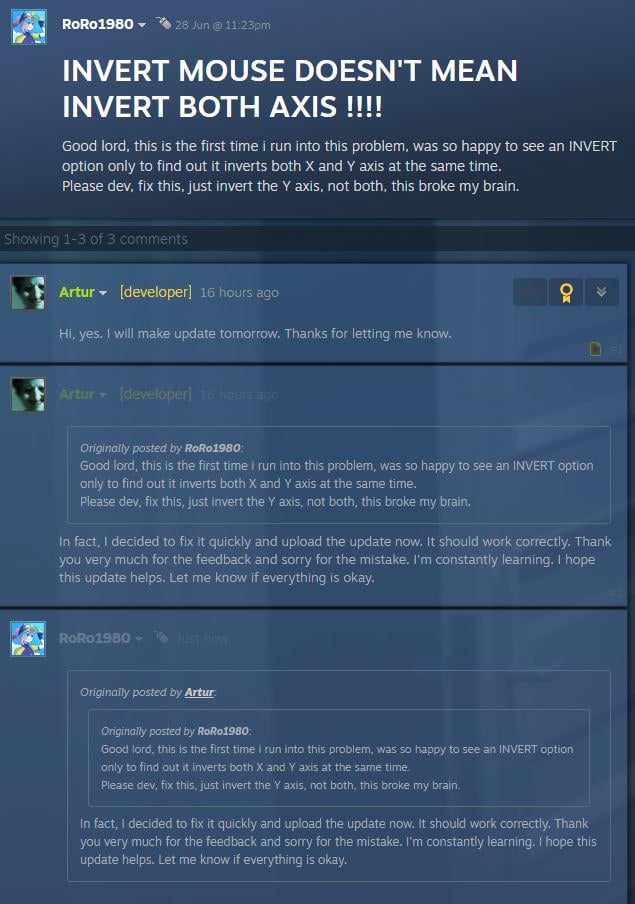 Got the game SUPERNORMAL on summer sale, good game but it had a weird problem with invert mouse control, posted it on discussion, the patch was made almost on the spot and with an apology from THE SINGLE DEV who did this game, not all heroes wear capes, and i thank him for this, will make me enjoy.