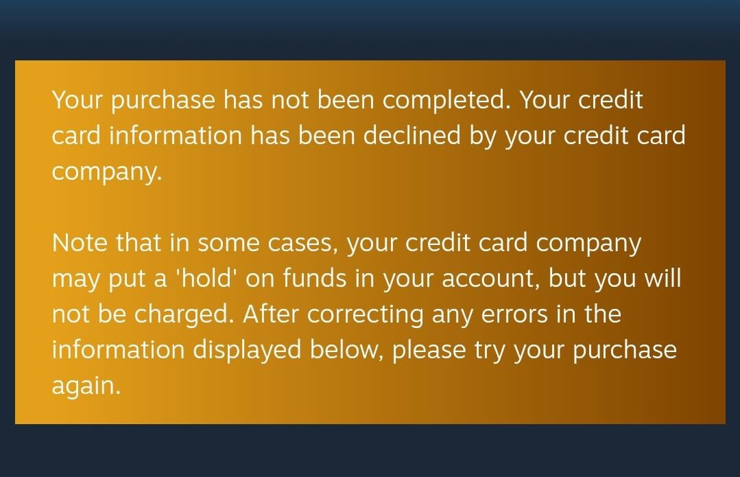 You should call the number on the back of your credit card for support! I once bought a $100 bundle and got this message, it turned out that my bank put a hold on my credit card because they were worried it wasn’t me using it. I bet that’s what happened here!