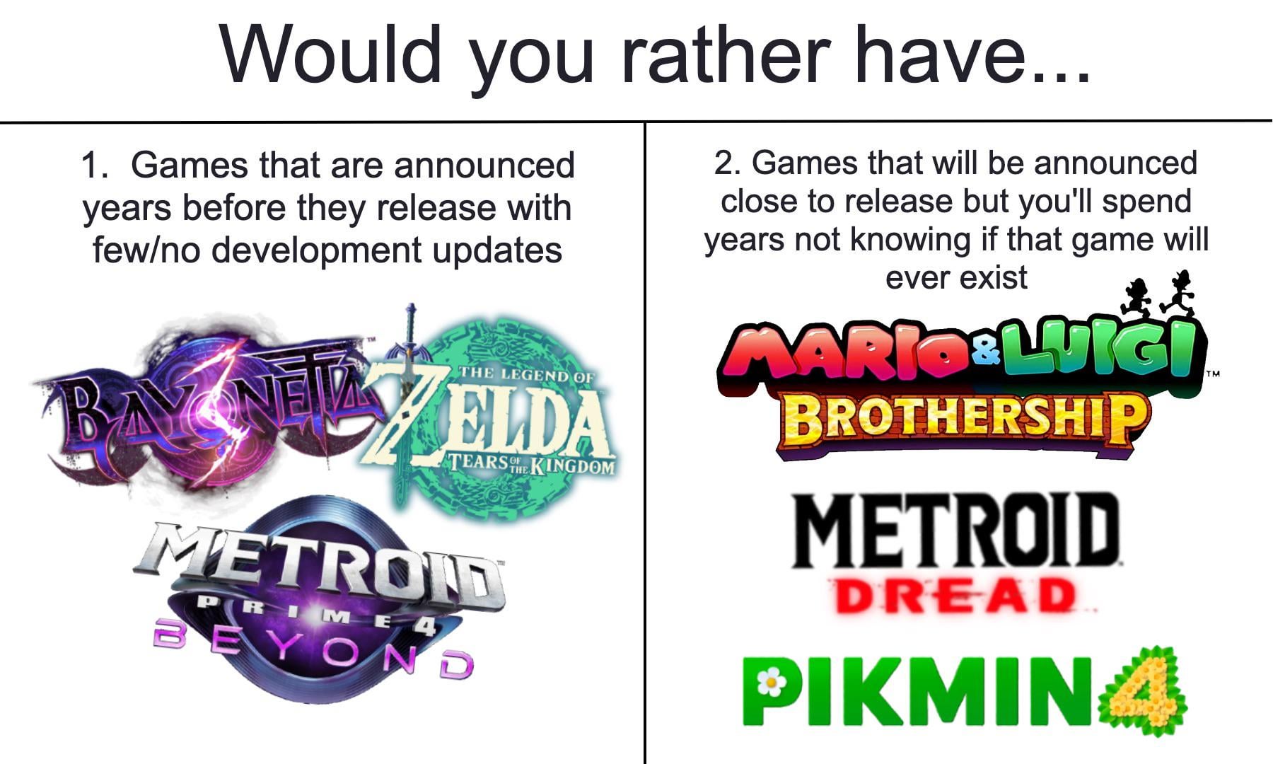 Both have pros and cons imo, but I personally perfer not knowing what Nintendo (and others) are cooking until it’s nearly complete. Because I know that the game I buy will most probably be a fully completed game that wasn’t rushed out of the door to meet a quarterly/holiday sales target,