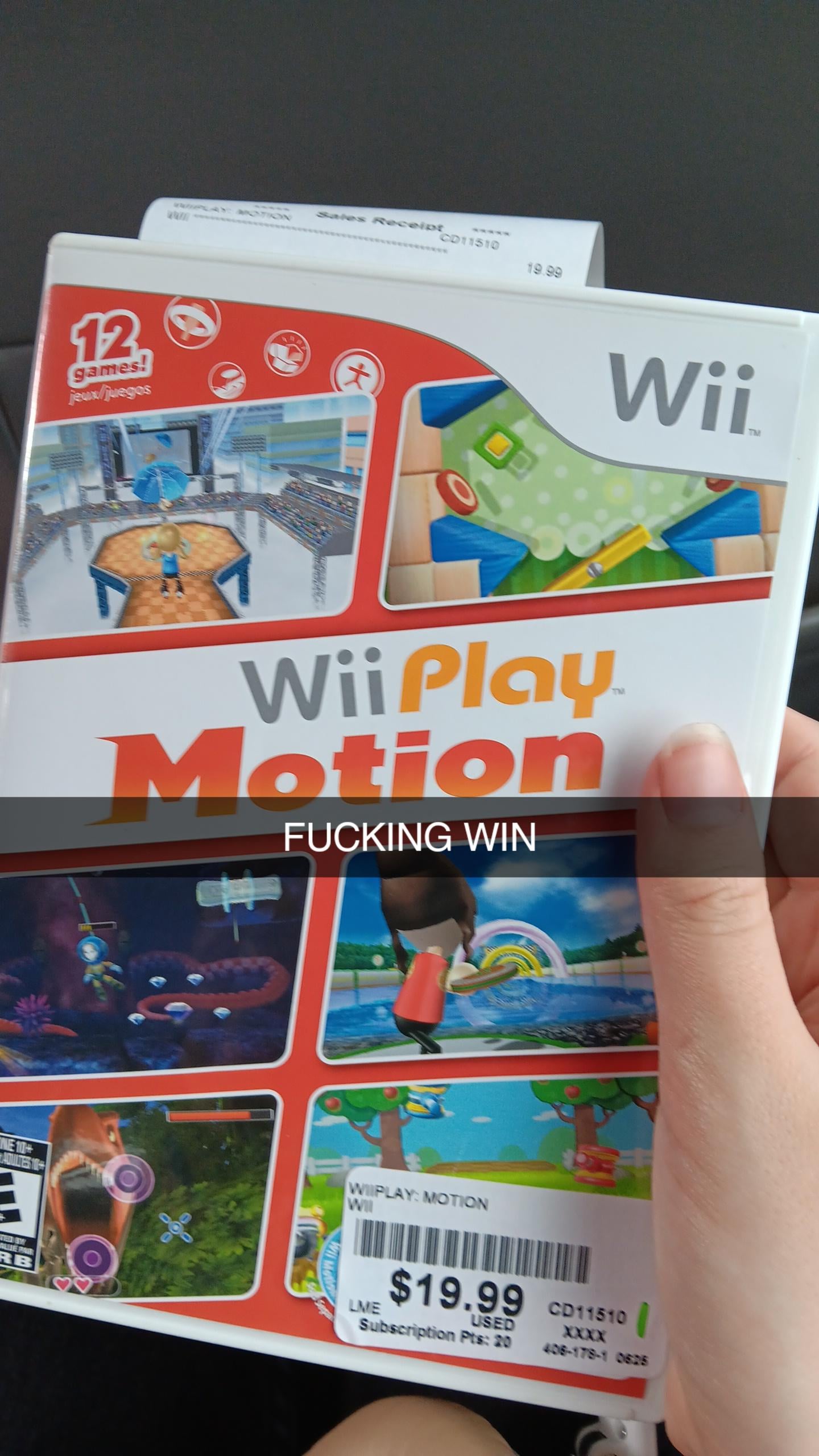 Amazing win (ignore caption it's from my snapchat) BUT DAMN IT AMAZING WIN + IT WAS ONLY 20 DOLLARS Also known as a casual special interest in the Nintendo Wii /sarc it's a major special interest Posted by KaiSatousfavfrypan