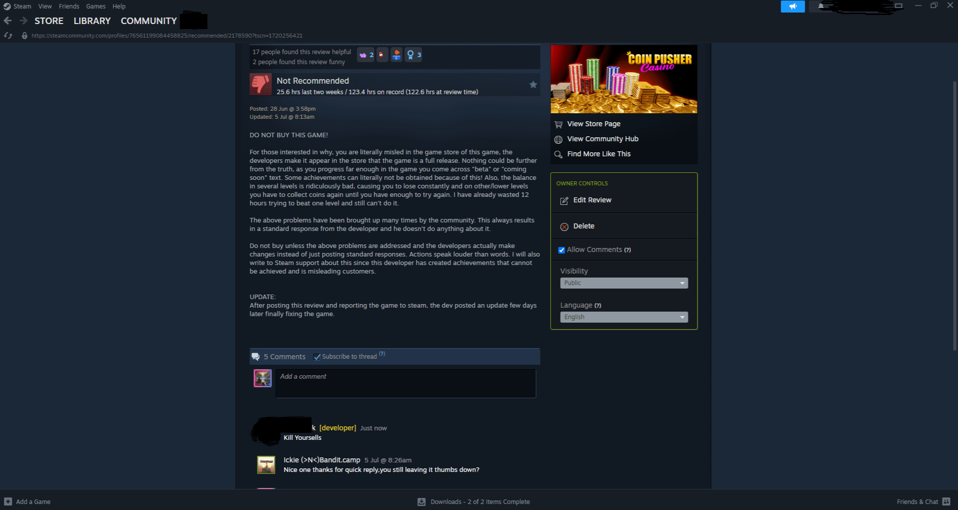 I will be reporting this user to steam, im just completly in shock how devs can be like this, I never had this experience with a dev before