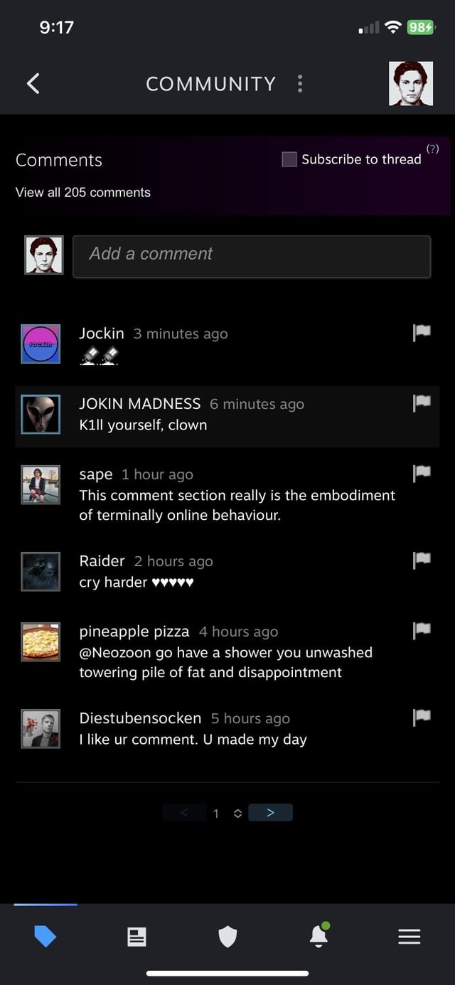 1. You can click the flag icon on the comments that encourage self-harm, Valve has been cracking down on such nastier insults lately. The profile owner can’t report comments themselves because the flag is then replaced by a trashcan icon. So if you feel bad, it’s something you can do for them.