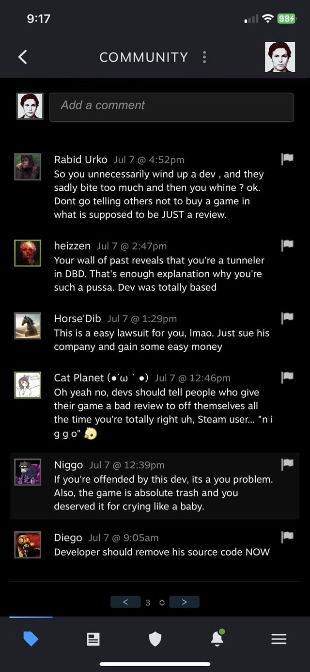 My man has been getting pages and pages of hate on his profile from bots who think it’s cool for a dev to tell a reviewer to kys. Honestly just playing dbd should’ve made you disable comments on your profile but this just reinforces that belief. Now you get the Andrew taint fans with the crybabies from dbd, yikes.