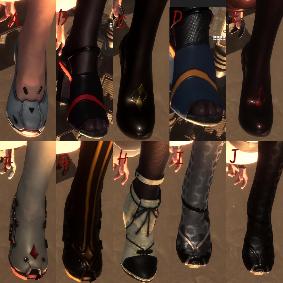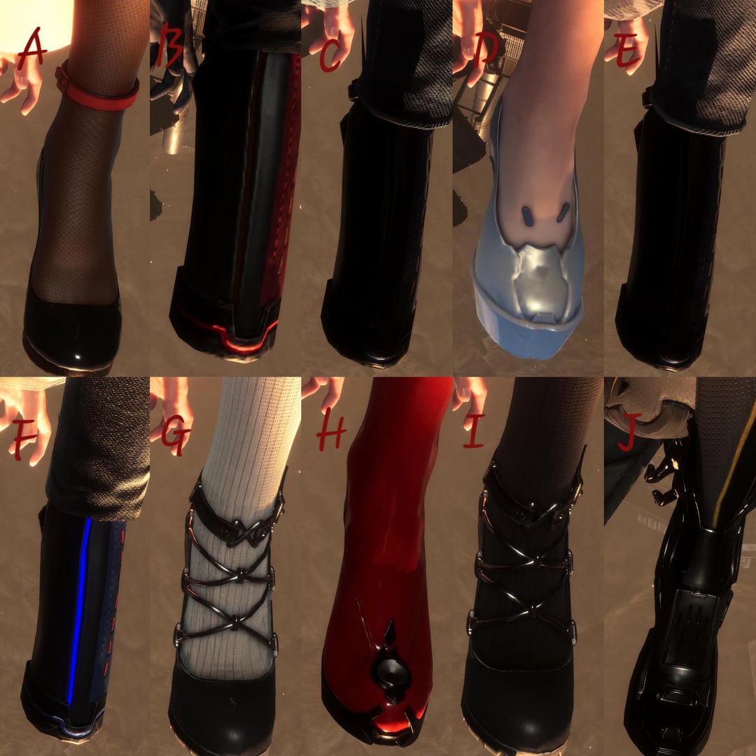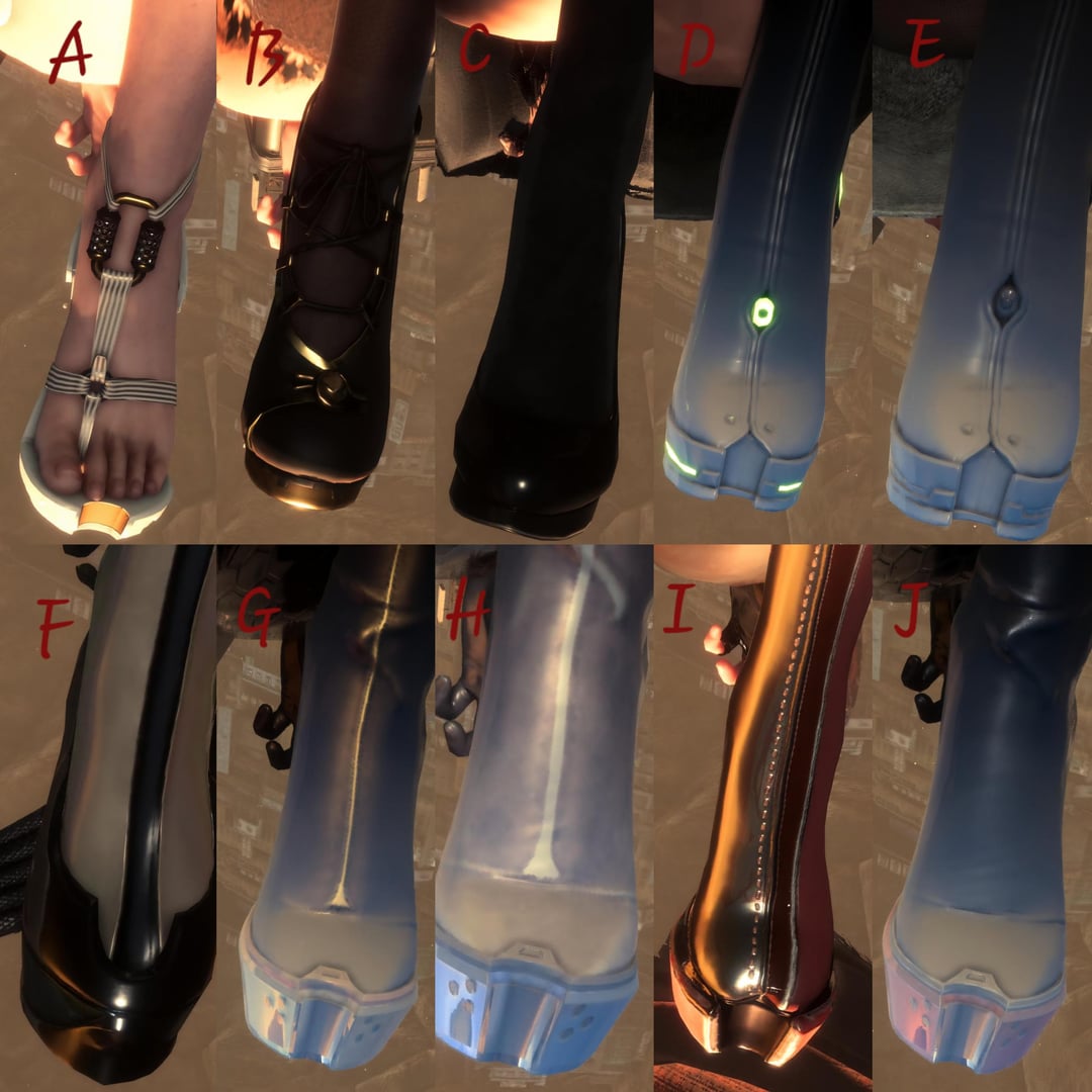 Here are almost all the foot wear in the game. It was rather taxing getting these shots. I'll admit I was really trying for some thicc thigh shots and was just gonna guise it under a heel display. Though I've read enough discussions on the topic of Eve's heels in other posts I figured yall would still be interested in close ups of her feet.