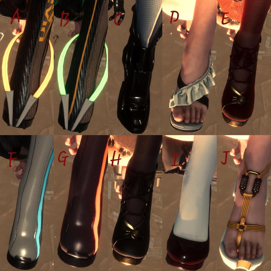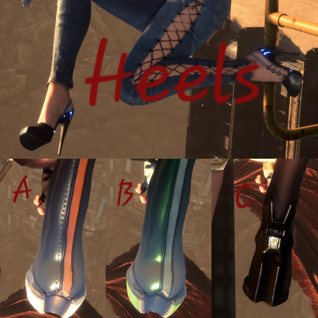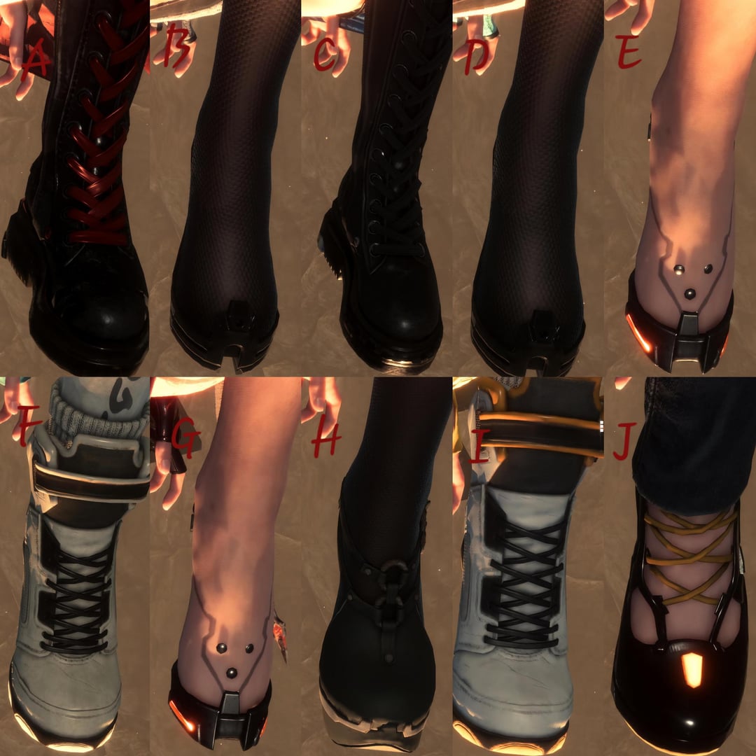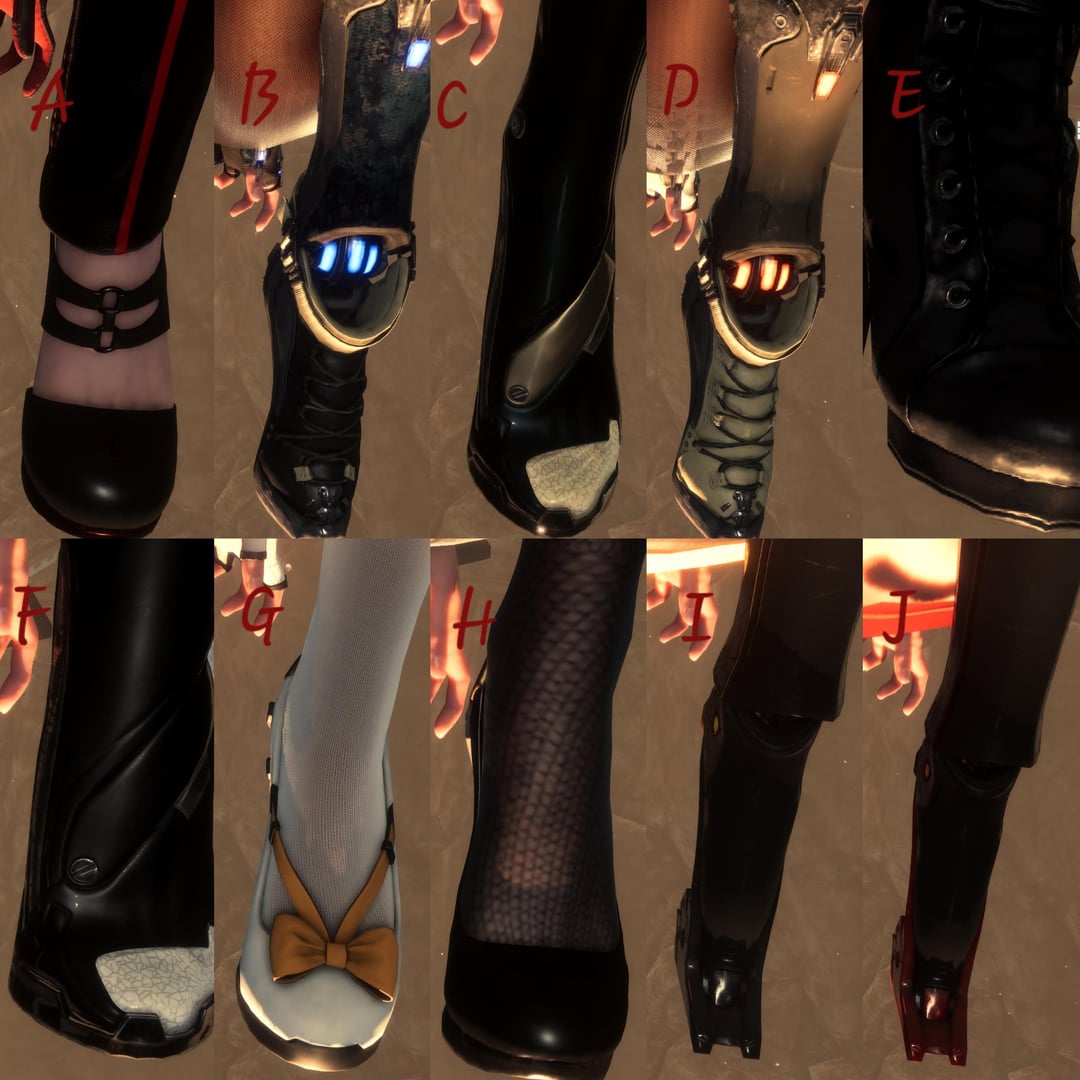 Here are almost all the foot wear in the game. It was rather taxing getting these shots. I'll admit I was really trying for some thicc thigh shots and was just gonna guise it under a heel display. Though I've read enough discussions on the topic of Eve's heels in other posts I figured yall would still be interested in close ups of her feet.