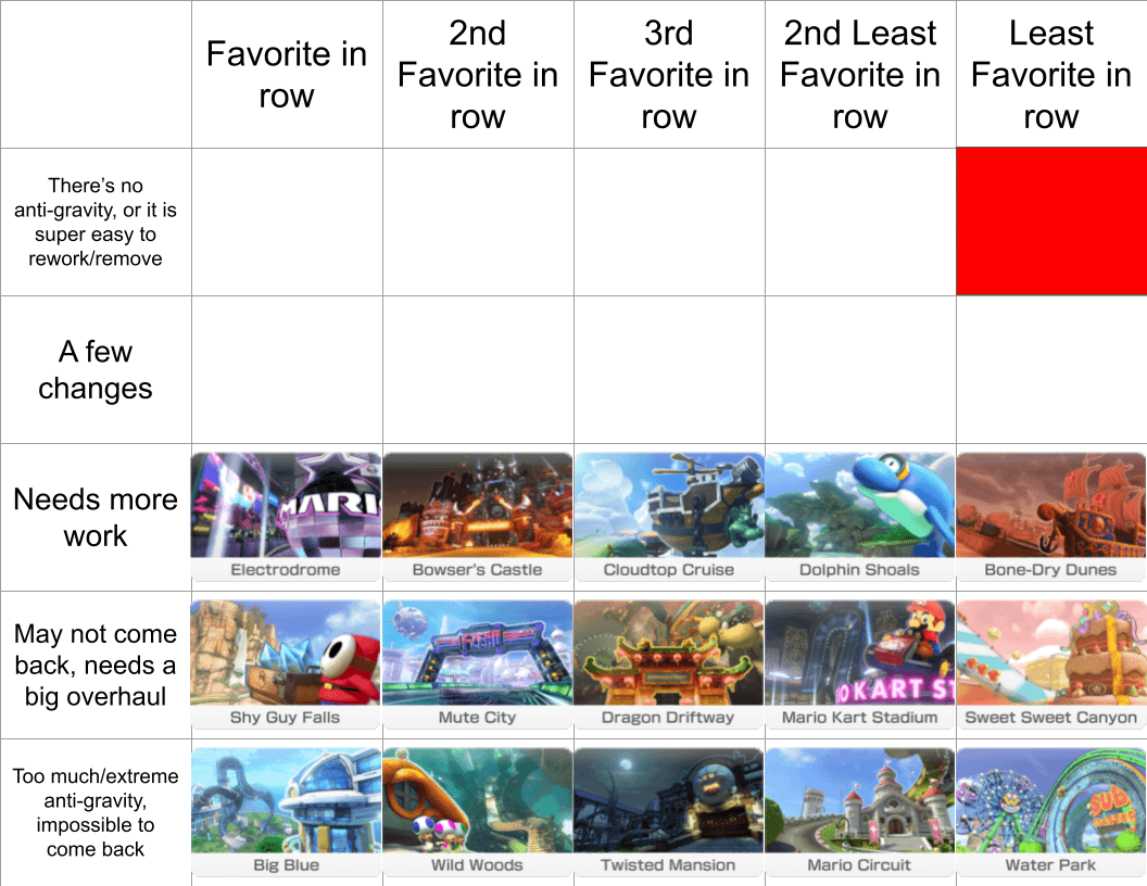 Alignment Chart Week 19 – “No/Easy” anti-gravity/Least Favorite in row: Which Mario Kart 8 Track belongs here now? (10 Left) Posted by Ok_Excitement2357