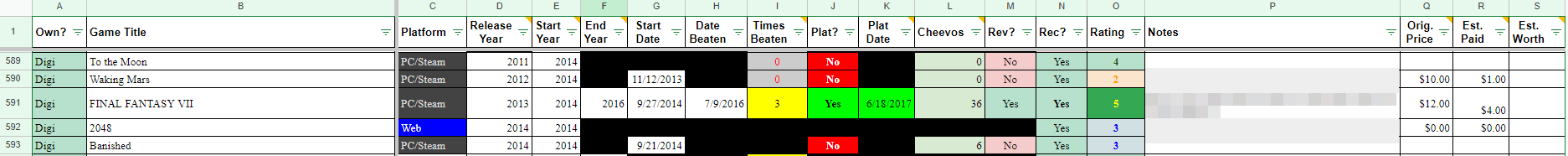 I'd additionally like to include prices (where available) from things like Pricecharting, "filter out" columns for games that aren't "beatable" or have no ending (the 2048 web game here, for example) so that when I'm seeing, let's say, how many games I've beaten in 2014, those don't get counted.