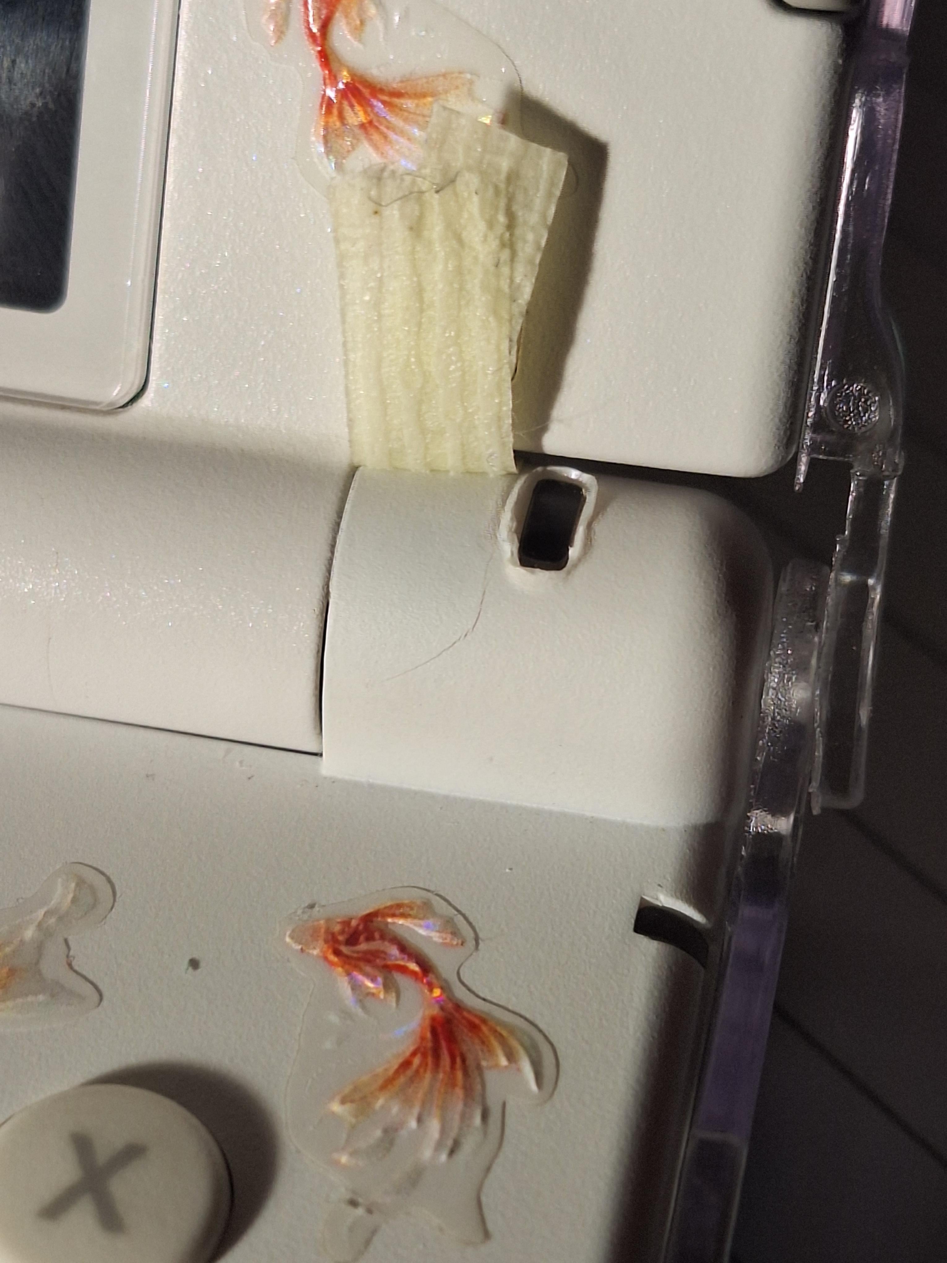 This is tied to the post i've made before about the small crack on the 3ds hinge, i've putted some scotch on it due to a moment of panic..i couldn't send a pic before, so here, to give a clearer idea of my situation. In how much time will it break? (I use it daily, or more like, 4 times one day, not use it for two days sometimes, and then again multiple times a day for some days again).