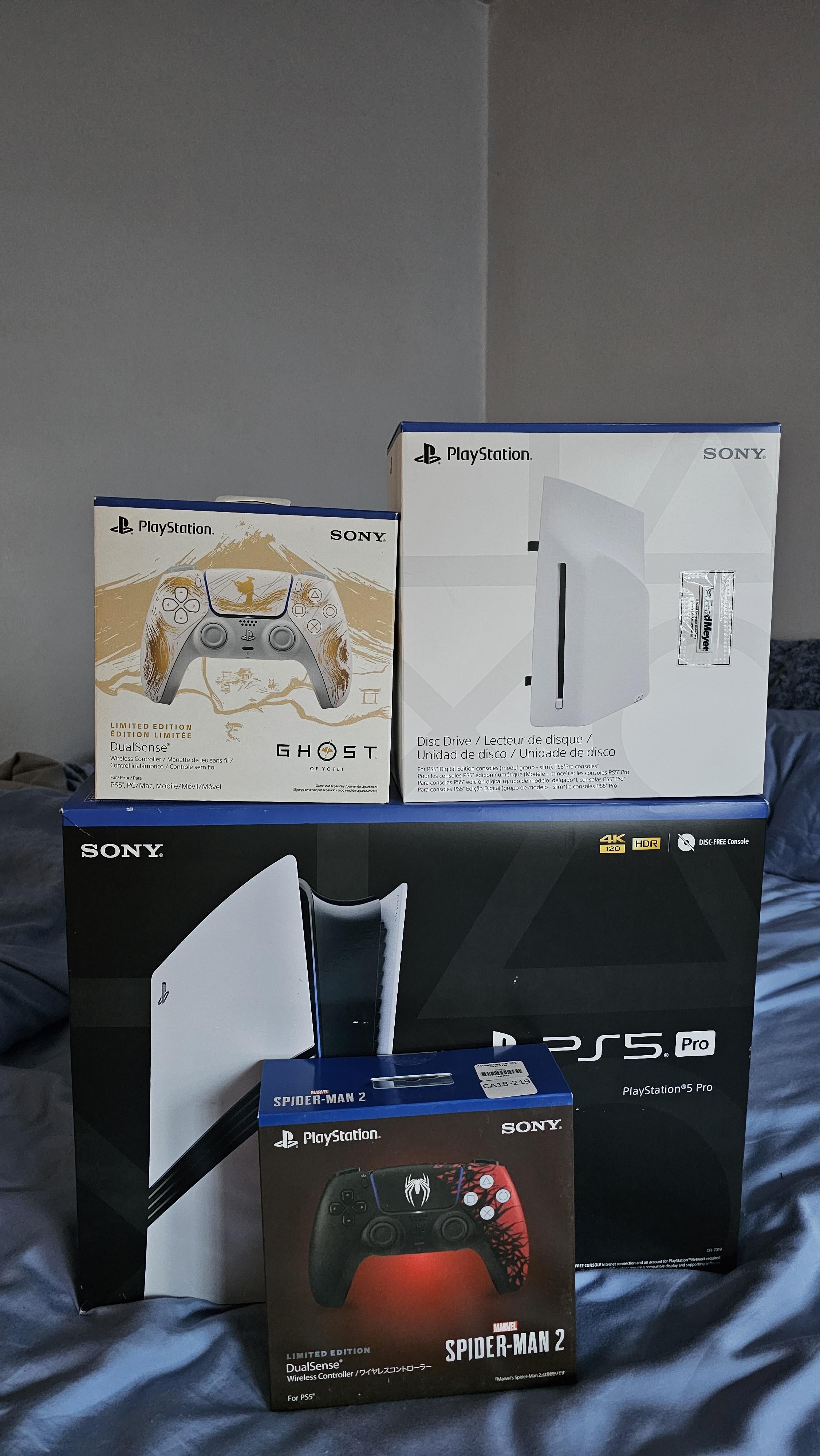 I originally ordered a ghost of yotei black edition, stand and controller charger. After a lot of feed back from the community i decided to send it all back except for the limited edition controllers. I found the ps5 pro for 400usd on fb marketplace, 84 for the ghost controller, 86 for the spider man and the oddly if you have dashpass they were offering 50 percent off up to 30 dollars at fredmyers. Disk drive is usually 84 after taxs here but I got it for 67 with the driver tip included. So 637 total spent.
