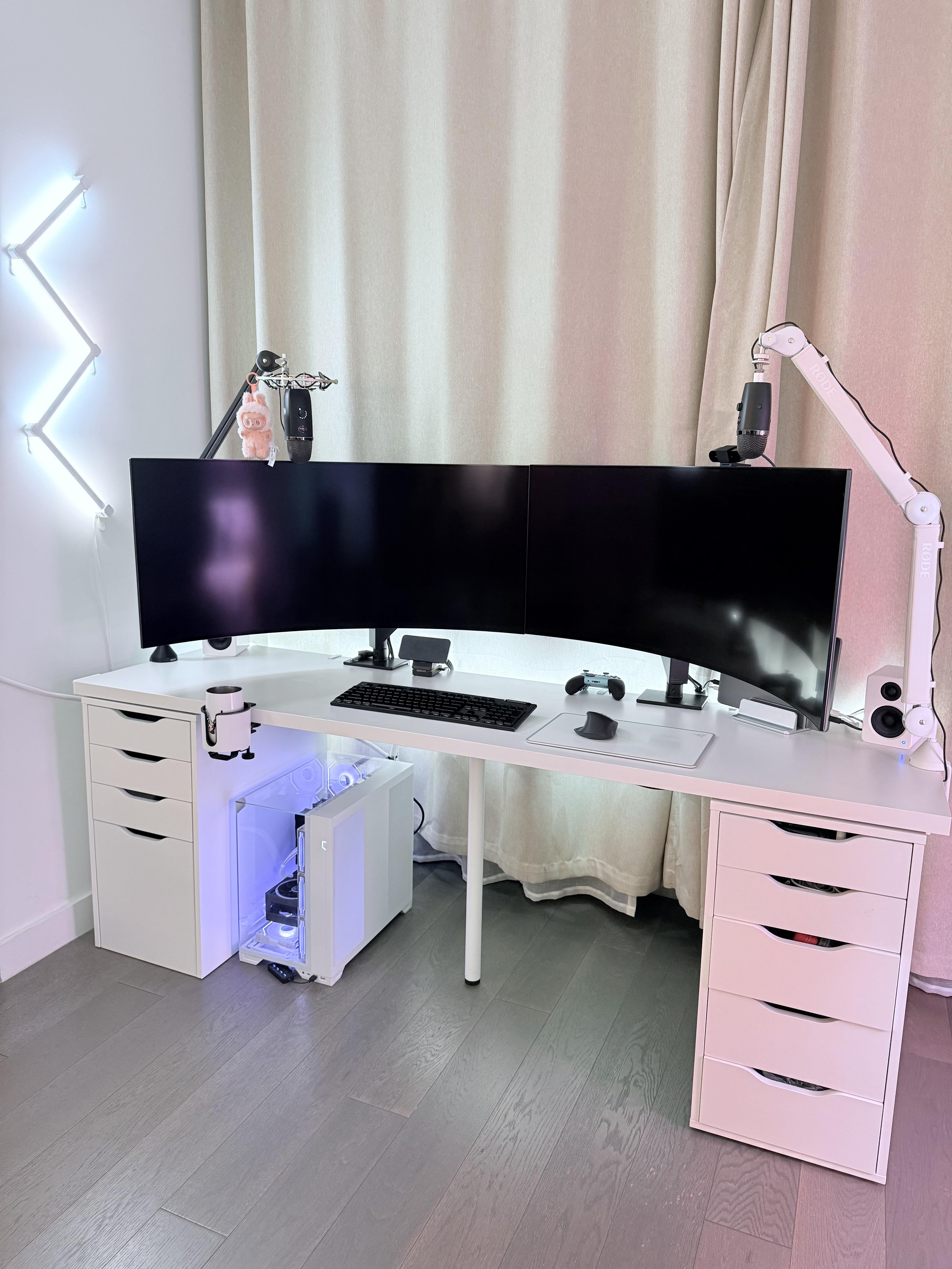 • Monitors: 2x 45” LG 5K2K. Bezel in the middle is intentional. Ergonomically speaking prob not the best, but I don’t mind it. They are used separately (gaming vs work), hence the two separate mics as well.