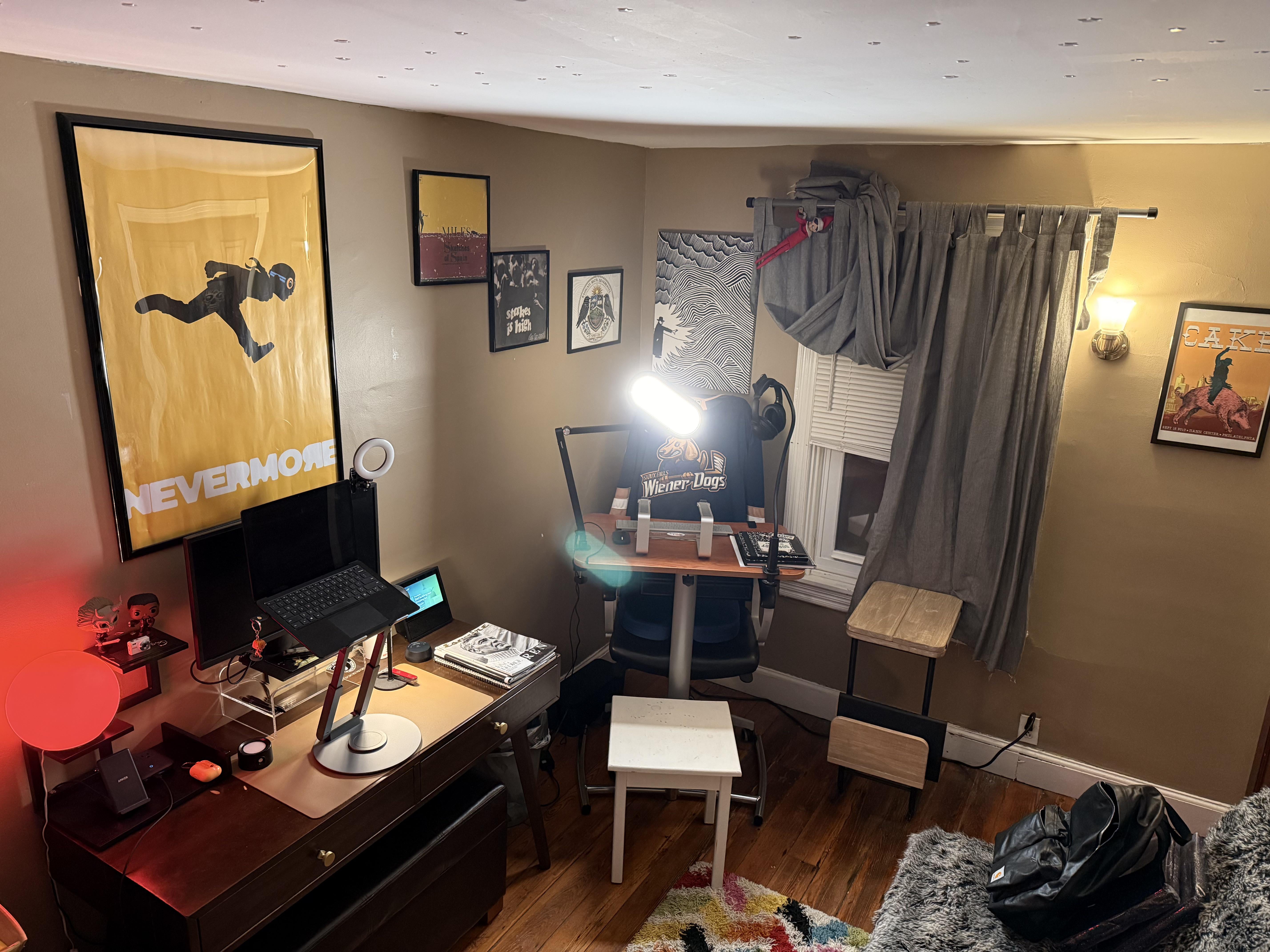 I use this space to game and work (PS5 not captured connected to a standalone monitor to the left of desk.) I primarily stand at the desk designed for sitting and sit at the desk designed for standing to the right of that desk.