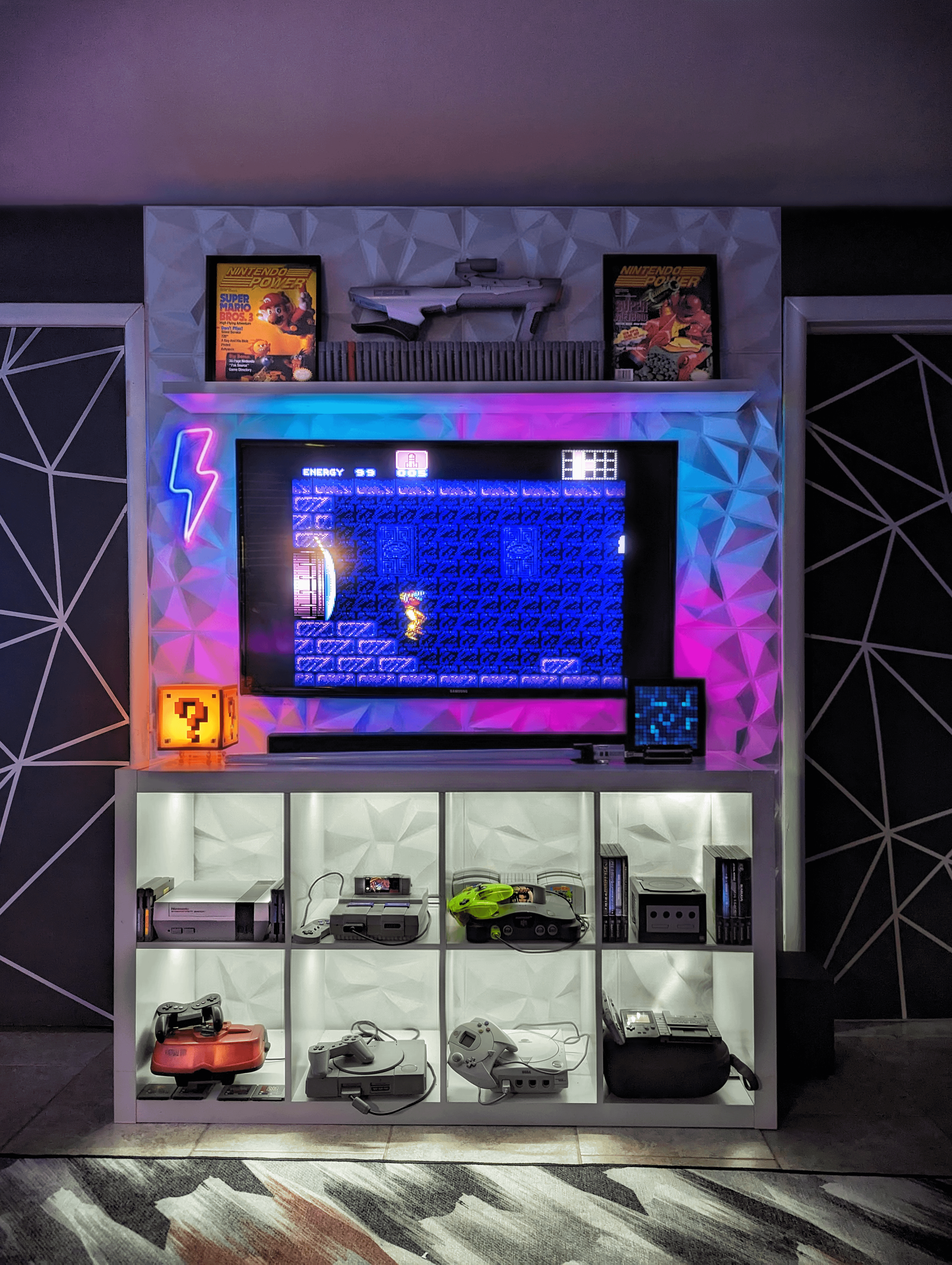 As promised in my previous r/battlestations post last month: My Ever Evolving Home Office. Now warmer, here is my Retro Zone update! I finally moved the geometric 3D tiles to the retro wall like I said I would and I think it fits the vibe perfectly. For context this is directly behind the picture I took of the desk.