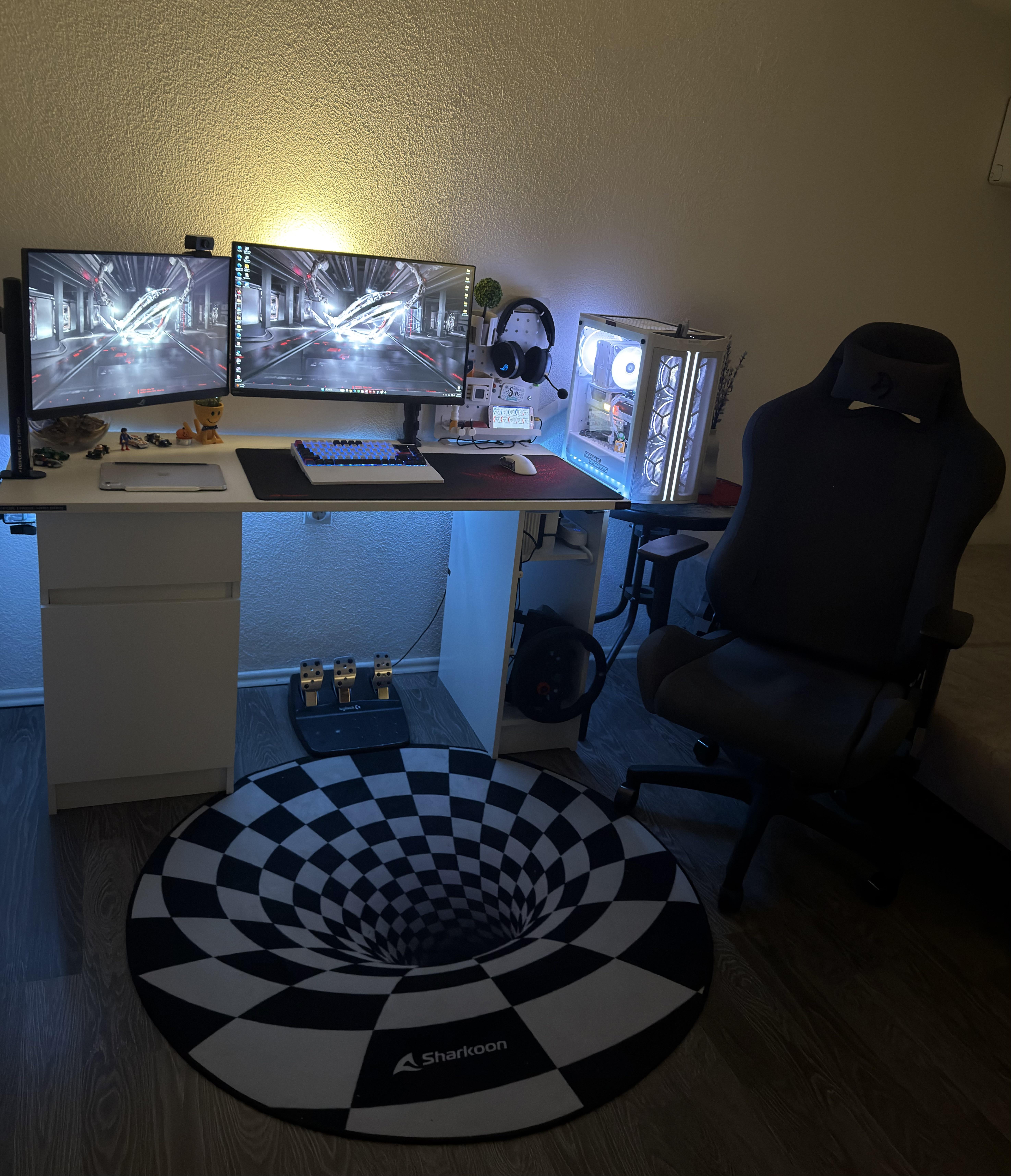 I tried my best to hide cables and be asthetic , the cables that are seen alittle are from my wheel, i sometimes take it off fully so it has to be like that 🙂