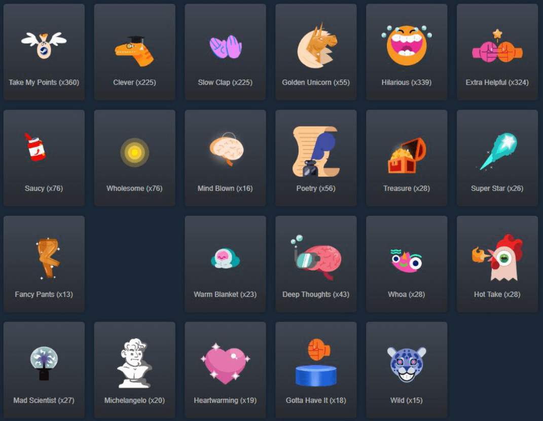 I liked those specific old awards because they felt more meaningful and easier to pick for genuinely helpful content, but the full new Second Edition set feels limited and a bit meh/emoji-like to me.