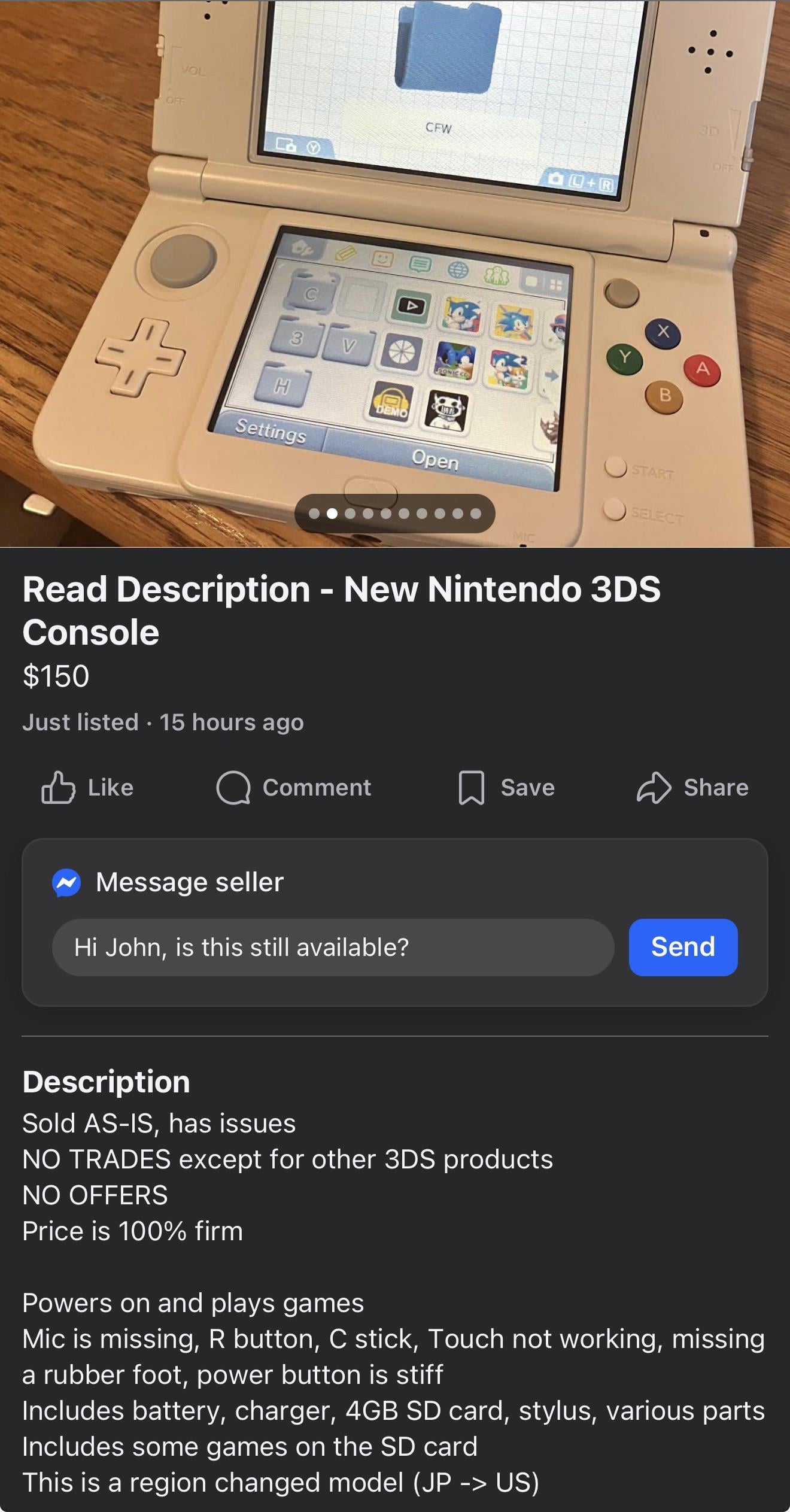 Mic is missing, R button, C stick, Touch not working, missing a rubber foot, power button is stiff