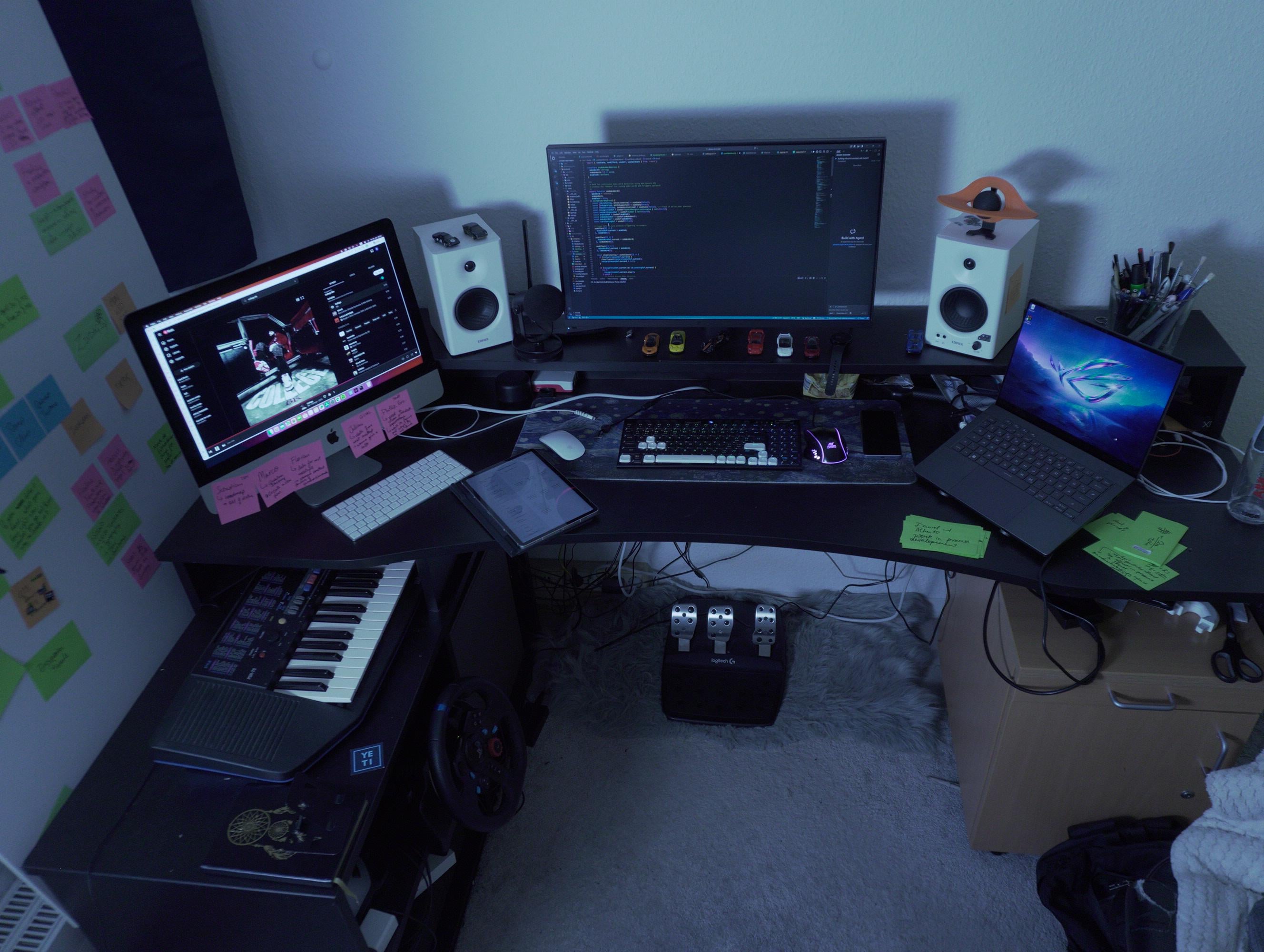 I think you got a good base, but it is too cluttered all together. Remove everything unnecessary, and get a cable tray under your desk to remove this cable spaghetti underneath. On the right shelf, it looks like a separate shelf? It does not fit the desk or room aesthetic at ALL from the wooden color imho. I would remove it, and if you have the space on the right, perhaps consider a bigger desk that leaves room underneath.