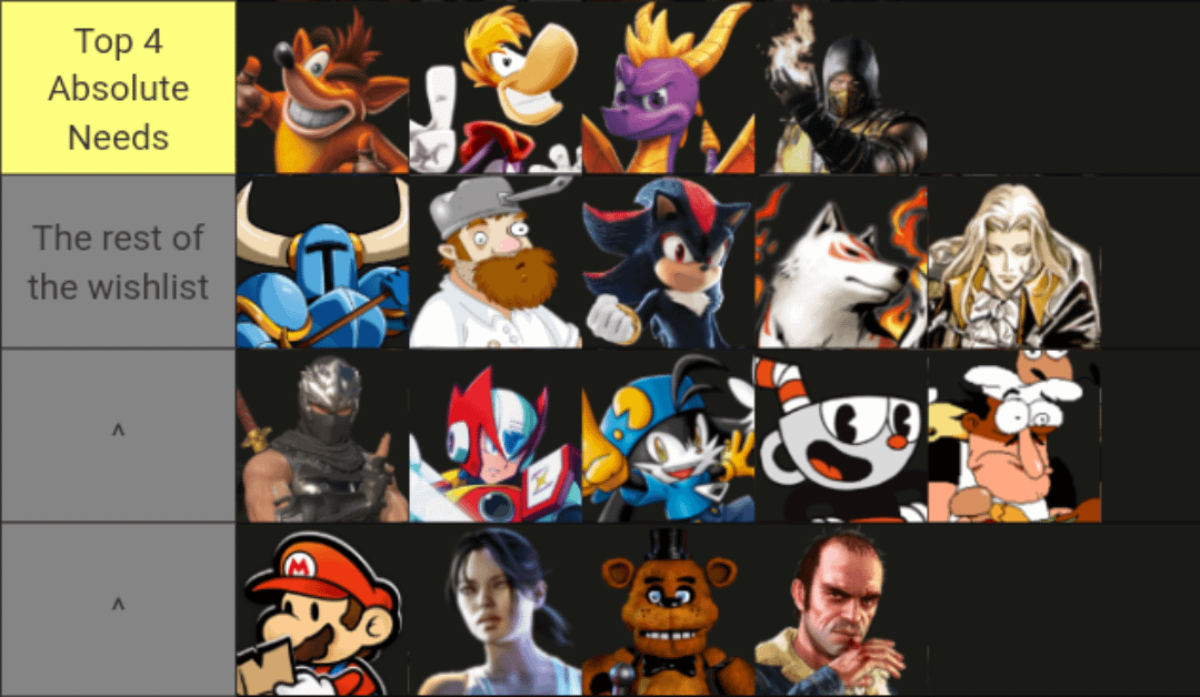 My wishlist for the next Smash game. I made extra tiers just so the image wouldn’t be mostly cropped.
