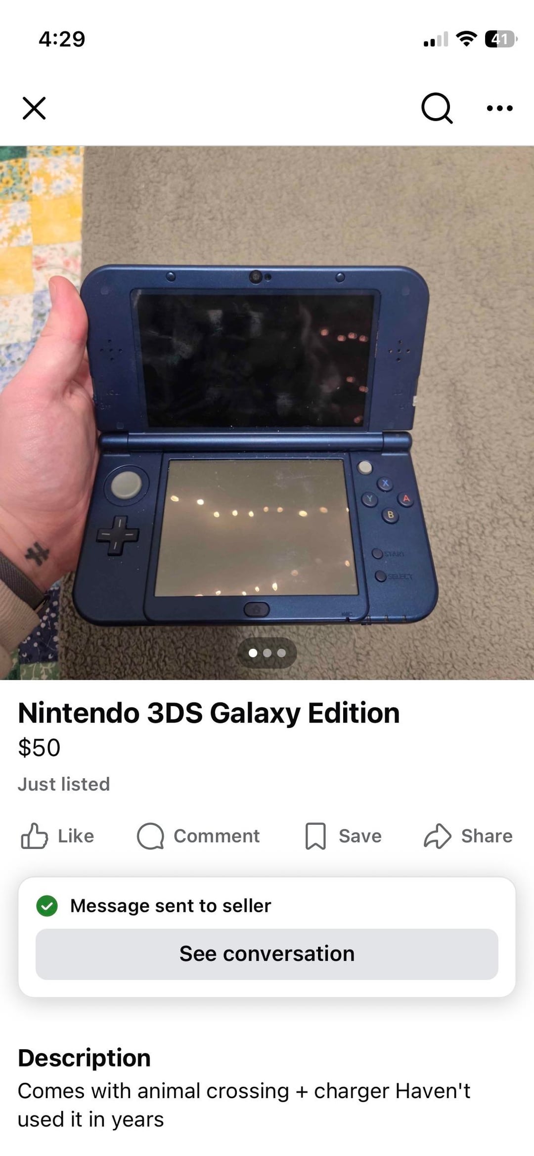 Checking marketplace religiously multiple times a day for video game goods has become a habit for me and I’ve finally hit the motherlode. Surely it was too good to be true? Nope. This thing is absolutely mint and charged up and powered on no problems. Came with the stylus and charger and a loose copy of AC Wild World. Guy was moving out for college, found it in his closet and listed it what must’ve been mere seconds before I opened Facebook. I was so eager I literally just stared at my messages for 10 minutes waiting for a reply. And then he replied with “full offer”? I double checked and made sure I didn’t miss a 0 lol. I almost sent a message while I was waiting for his first reply I was so nervous and wanted to make sure I was the first to snag it. Part of me thought I was going to get robbed or it was junk, but I really had a feeling I was about to score this for $50. And I did!!!