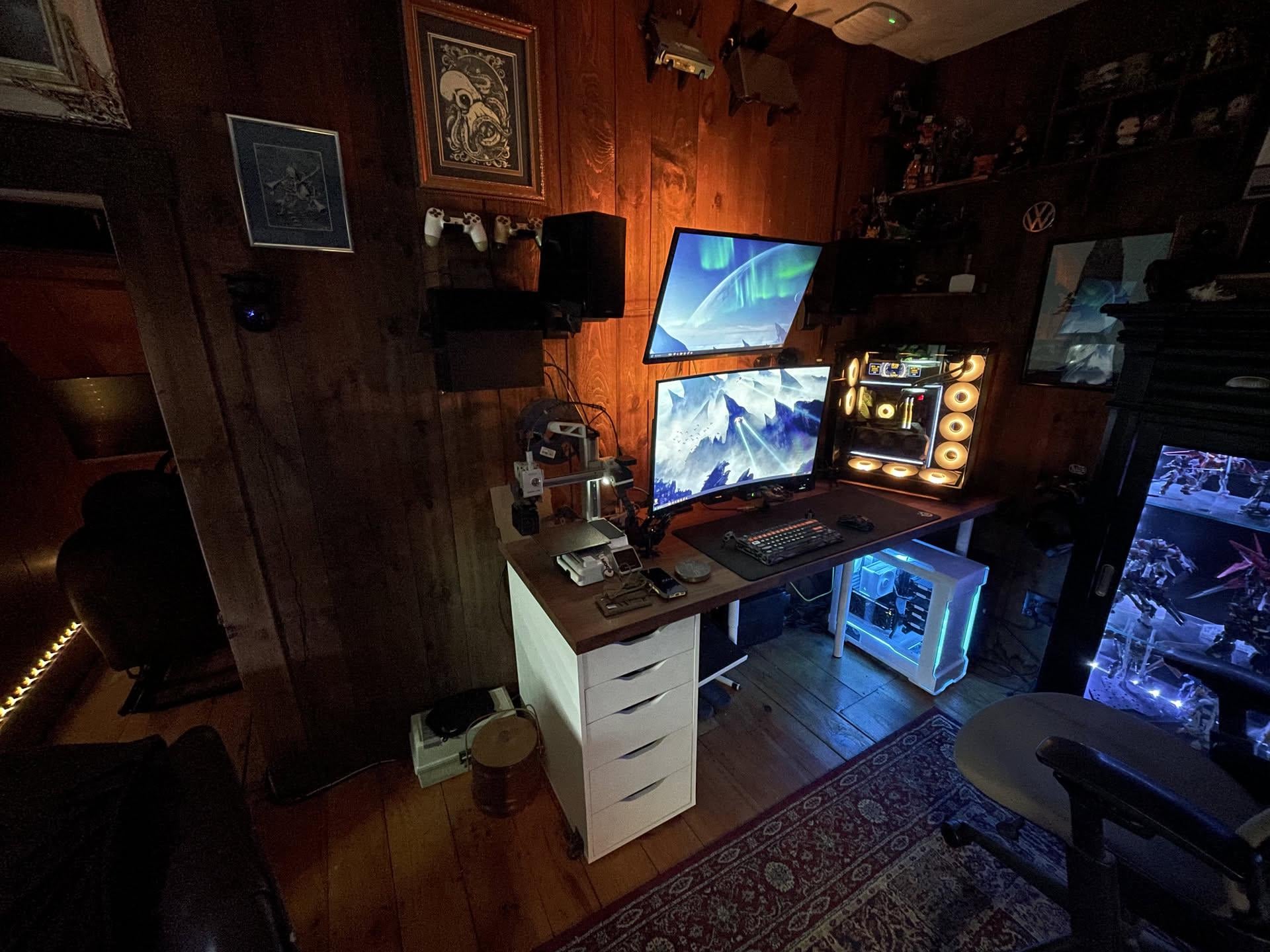 Updated my gaming computer (the black NV7 with orange fans) to a decent AM5 setup. Unraid rig is underneath. Sim rig with a displayport switch and an Asus ultrawide in the closet. TP-link Omada networking, bambu mini, Edifier speakers, a UPS, and an old man footrest (underrated).