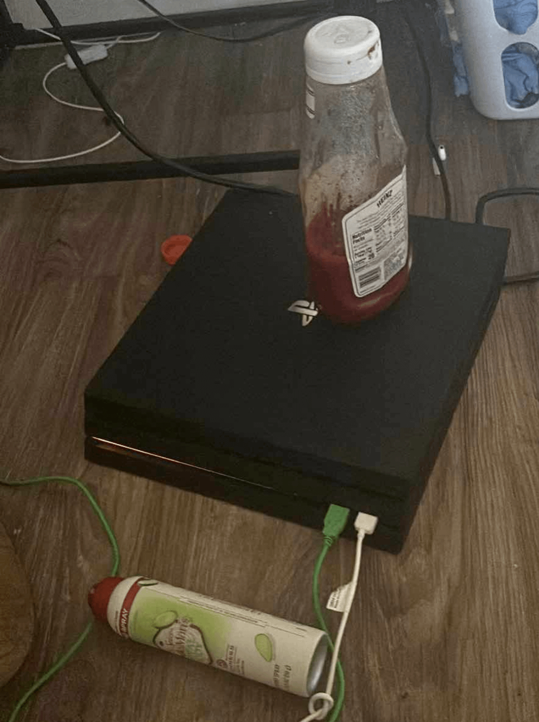 He’s using an over heating ps4 to warm his ketchup and probably cook his eggs given the Pam in a can