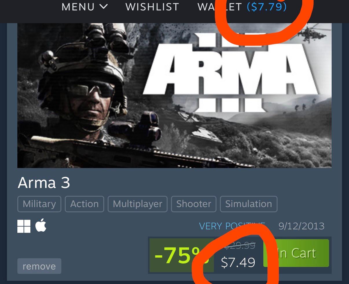 I don’t know if you have already seen it as I woke up very early today, but Arma 3 just went in sale for $7.49. I have been waiting for this for some time now so I saved $7.79 expecting it to be $2.99 again as it has in the past. I excitedly went to go buy it but was slapped in the face with tax and I am missing 32 cents. Is there anyway I can cover the tax without adding more money to my account?