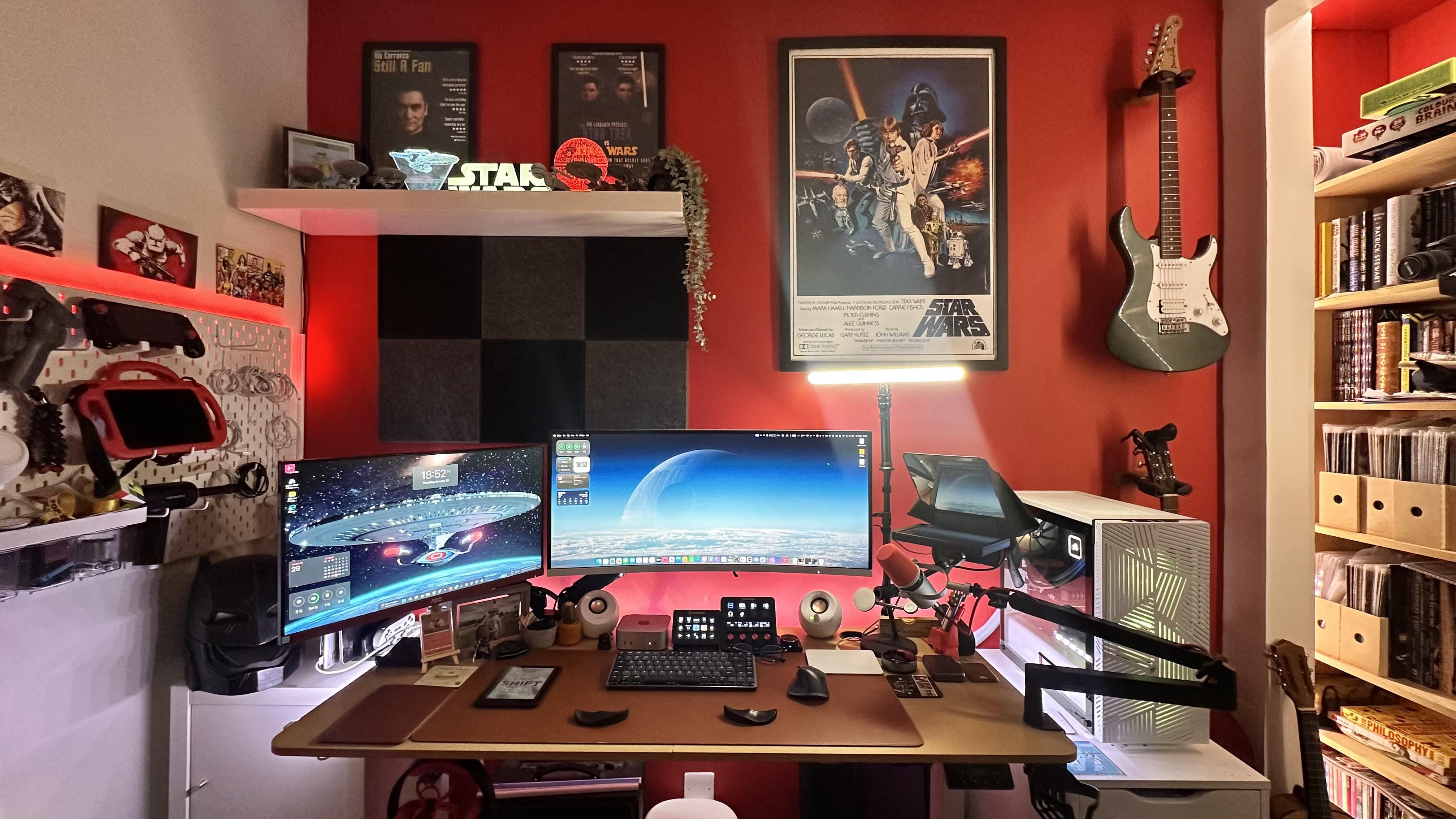 Do not like the red wall with the wooden desk & wood color ish mousepad in combination, and then white walls on the sides. Setup defo has personality and looks clean in general tho, but not my cup of tea. I think this would look really great with wooden acoustic panels on the wall and really elevate the setup.