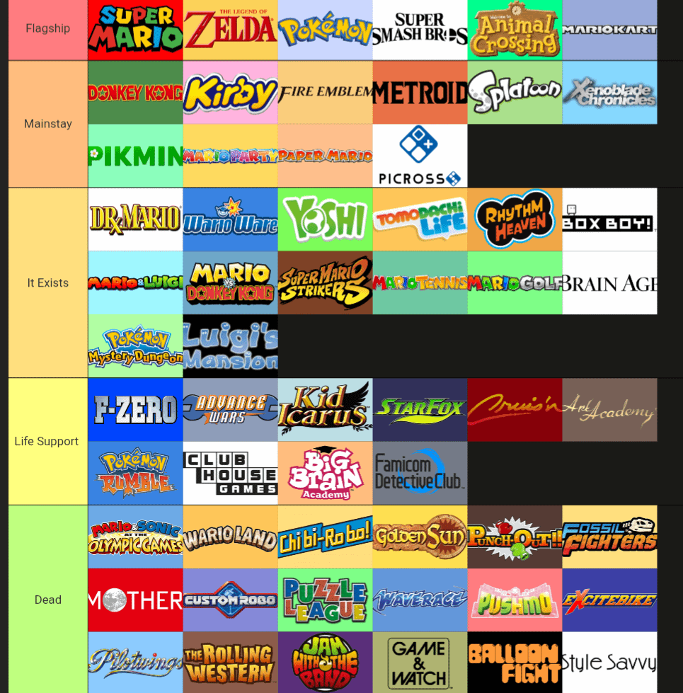 Flagship: These are system sellers, and will always get new games as long as Nintendo exists. EVERYONE knows what these franchises are, even non-gamers