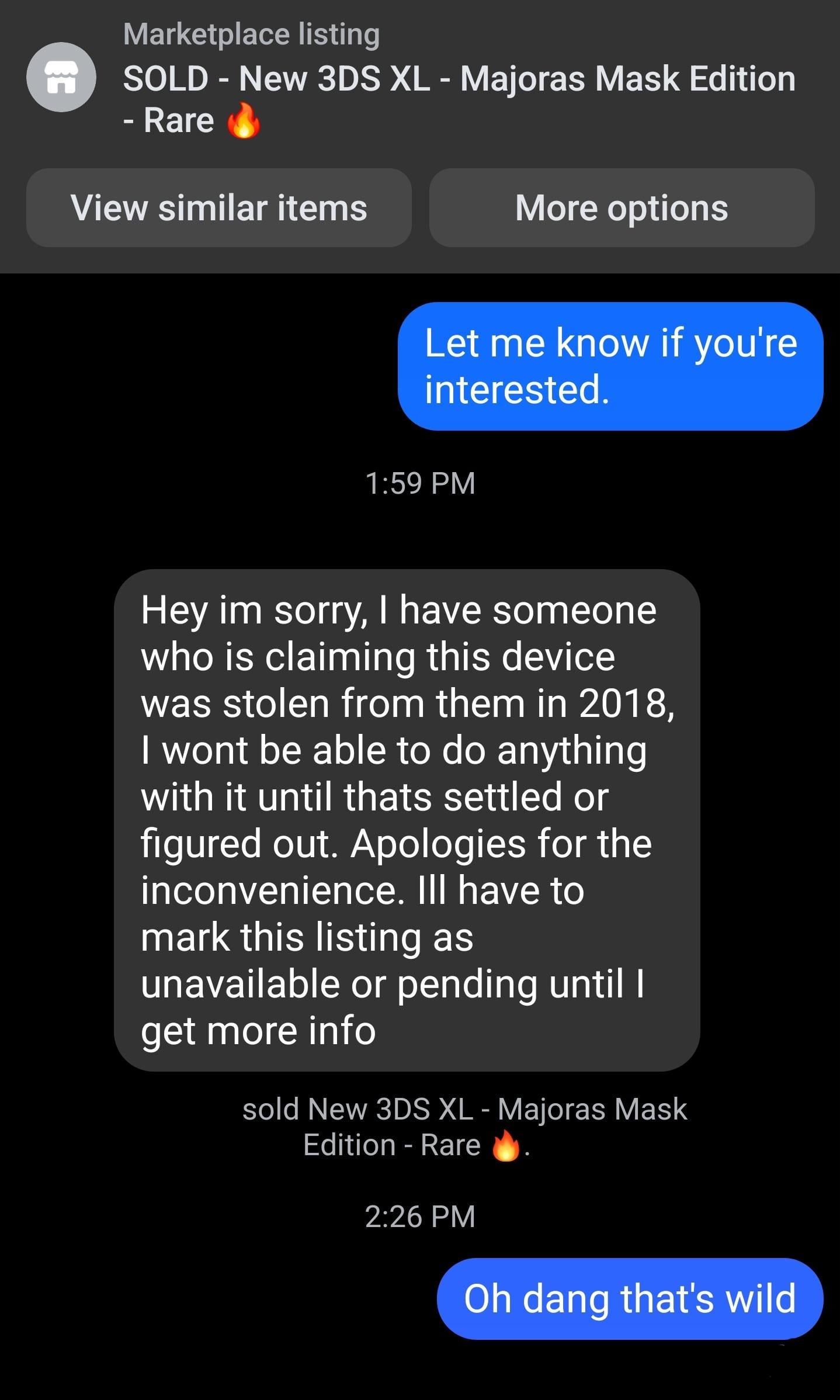 Was browsing Facebook marketplace and saw a Majora's Mask 3DS. I was left on read and followed up because I was super interested in this (obviously). And the seller responded with this?