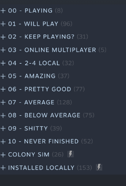 That many categories stresses me out haha I just have Backlog, Completed, and Playing.