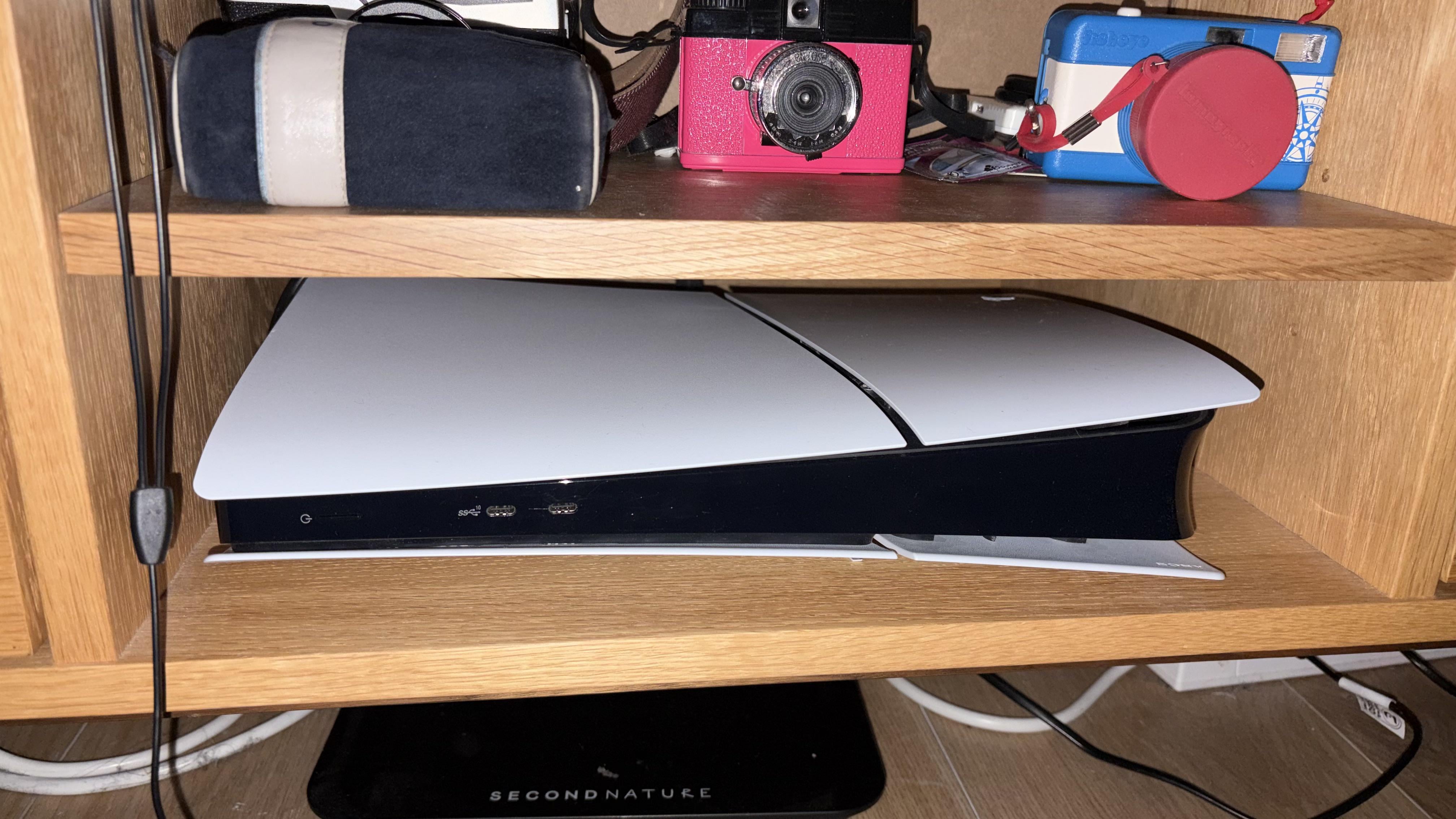 Show us the back of the cabinet. If there is a big enough vent then this will be fine. A small circular cable vent will probably not be enough, esp since it’s being filled by the ps5 cords going through. You’d need a long rectangular vent spanning the length of the cubby