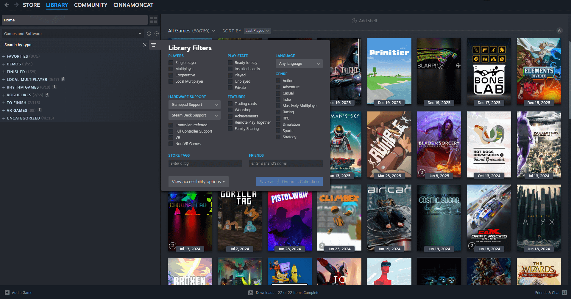 I somehow made the steam library hide all non-vr games but display like normal, and the category game totals now show a remaining count/total. There are even categories that arent showing up in this screenshot because they have no vr games.
