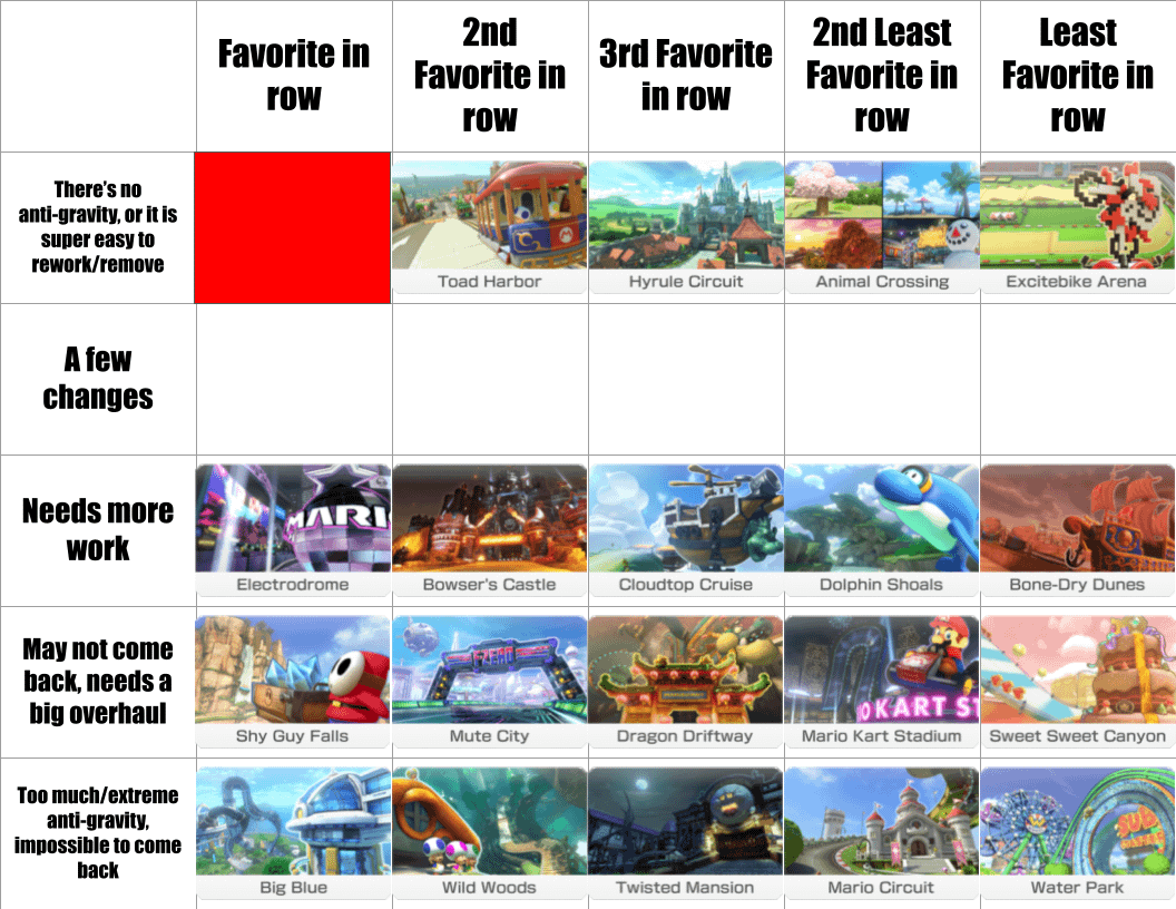 Every Sunday and its following week, you’re voting for which Mario Kart 8 nitro track (meaning that track originates in Mario Kart 8, not anywhere else, not even Mario Kart Wii mods) belongs in the spot that’s currently red. (so for example, you can't pick Baby Park, not only because someone made the mistake of saying it belongs there, but it's also from Double Dash, a game older than Mario Kart 8). You also cannot pick any course that has already been selected, so Water Park? Done, bottom right. You cannot move it anymore.