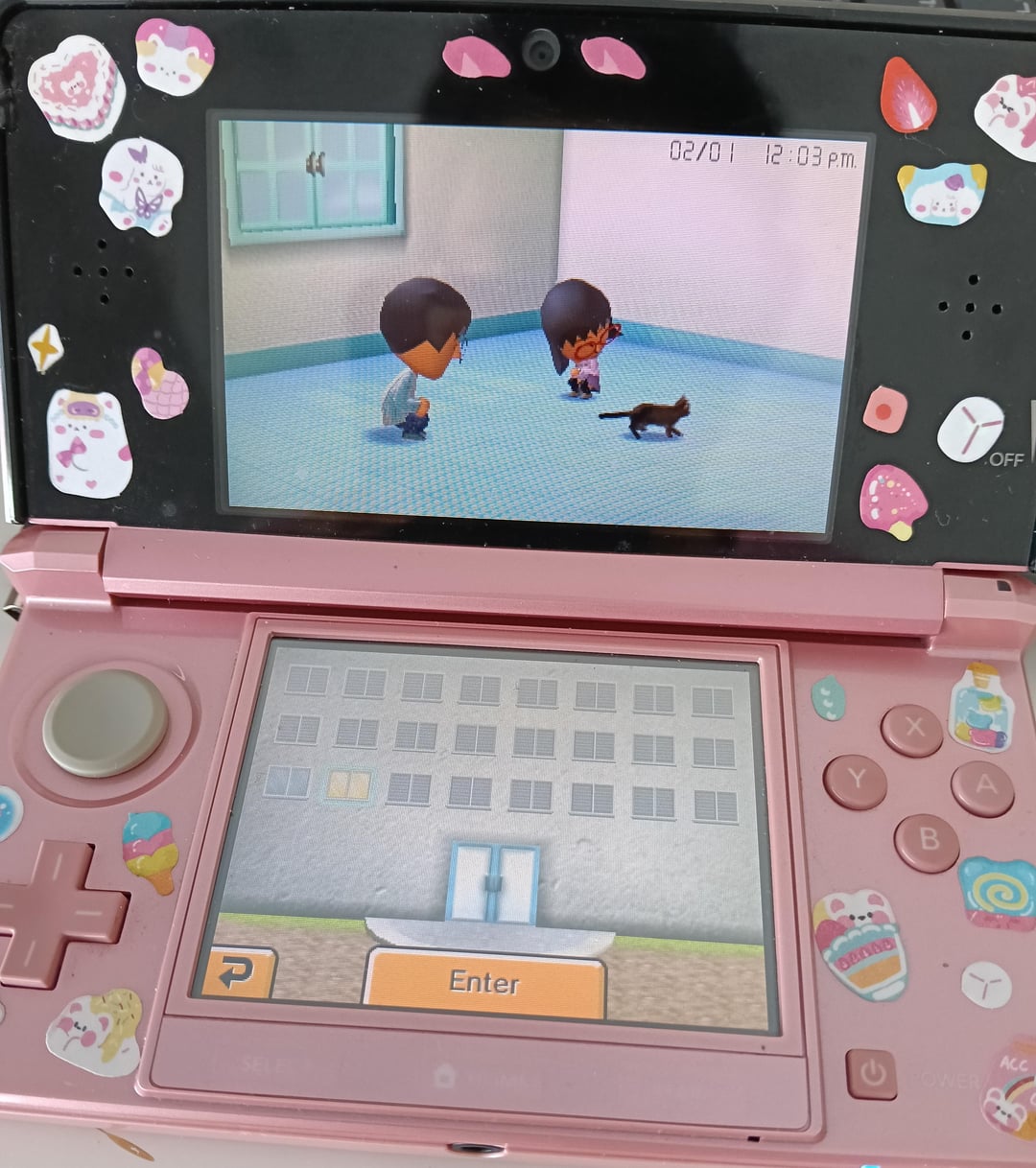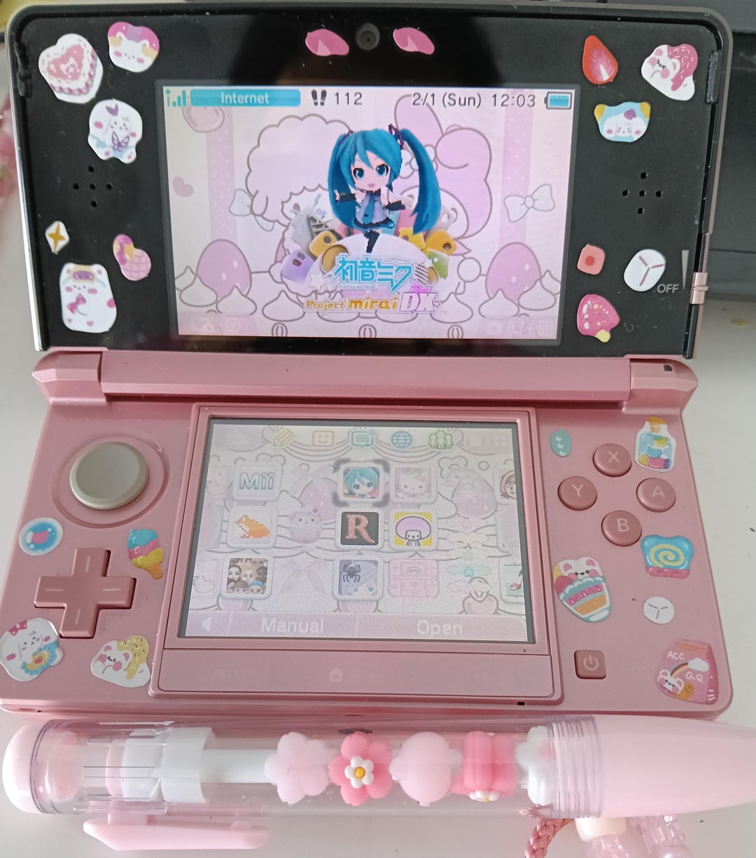 anyways the previous post got deleted cus it broke the rules lol, but heres the updated look for my 3ds ! my favorite games so far are p mirai dx, rhythm thief, styling star and miitopia♡♡