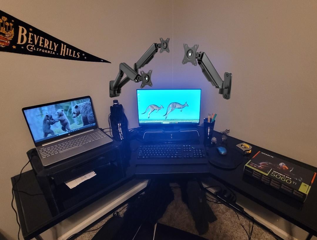 I know I'm putting the horse in front of the cart here but after I have all my PC parts I'm thinking of doing a set up like this. Assuming I get them level do you see any problems? The desk is glass and a little too flimsy to support three clamped monitors