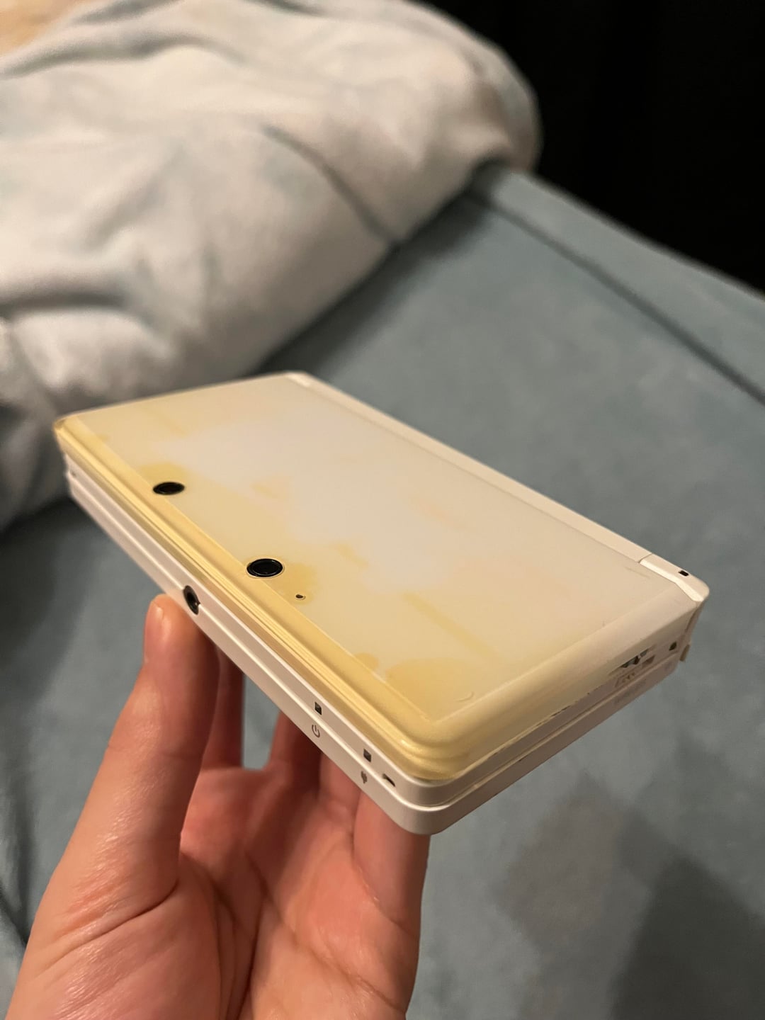 I’ve had this Nintendo 3DS for years and it was always white and clean. About six months ago I left home for a long period, and when I came back and picked it up again, I noticed this weird yellowing pattern on the top shell.