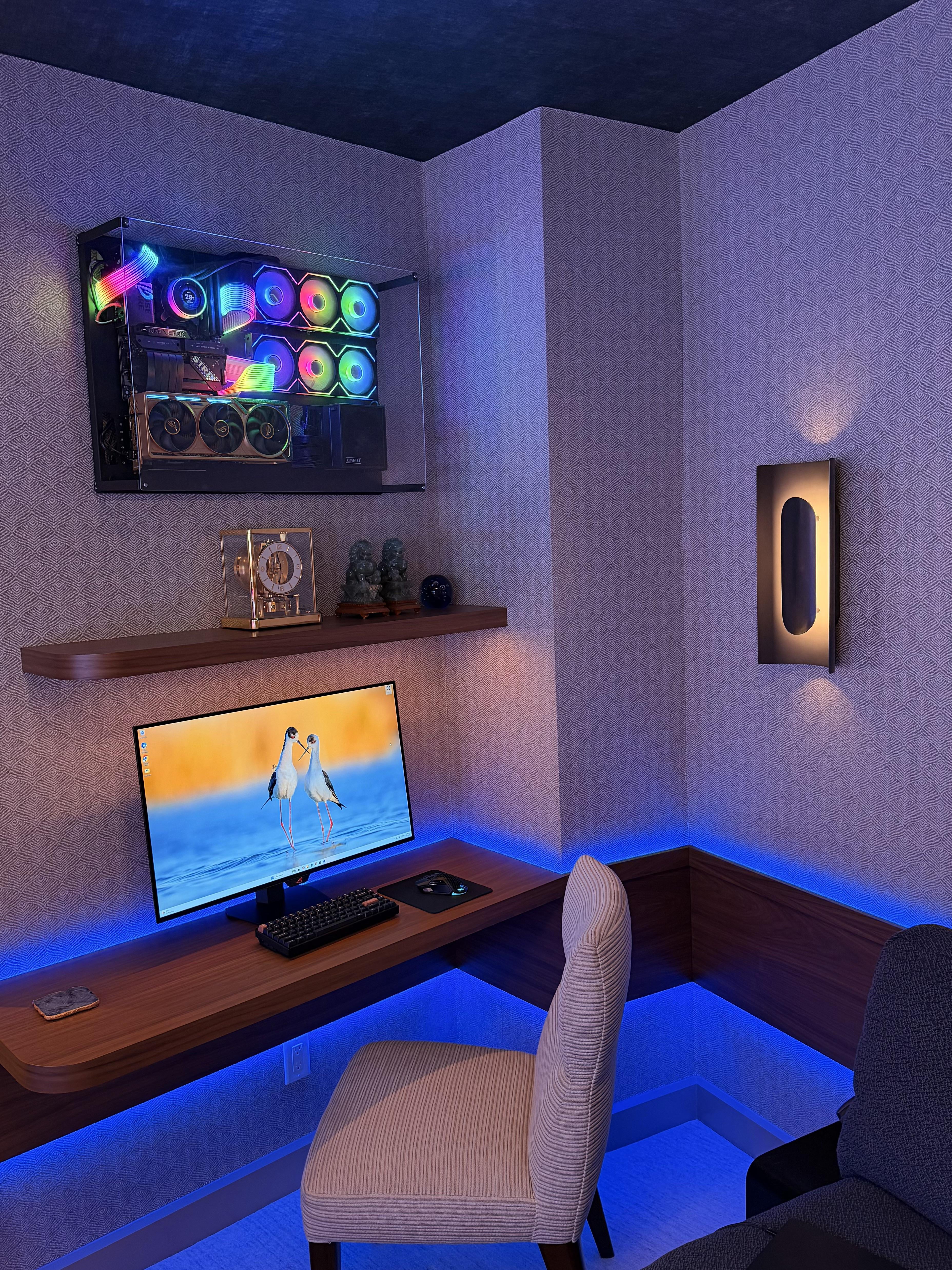 This wall-mounted PC is part of a larger media room built around clean lines, hidden cables, and soft architectural lighting. The goal was powerful technology that stays visually quiet so the space feels calm and intentional. This workstation corner is one piece of a broader home theater media room.