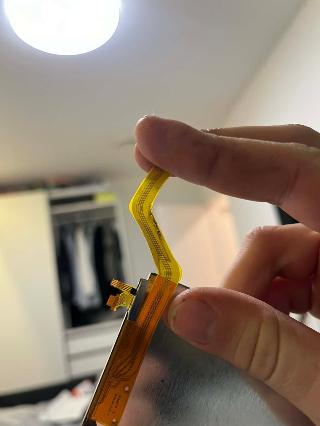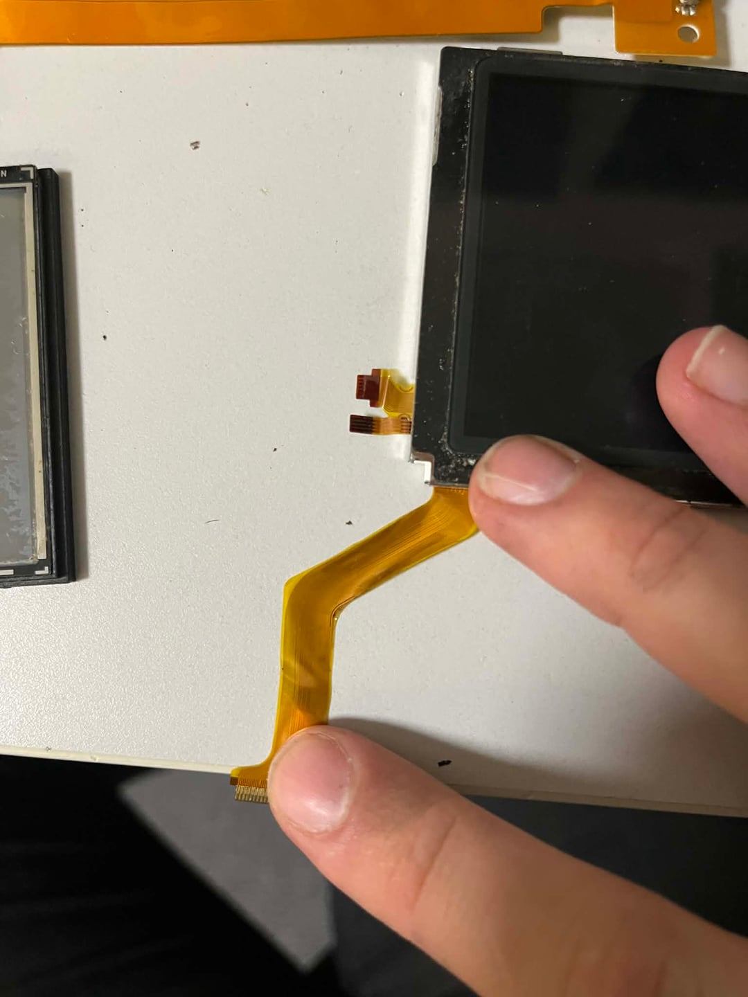 While opening it, I noticed that the top screen ribbon cable has visible discoloration and marks, especially around the hinge area. I have no idea how the screen behaves and I’m unsure whether this screen is still usable.