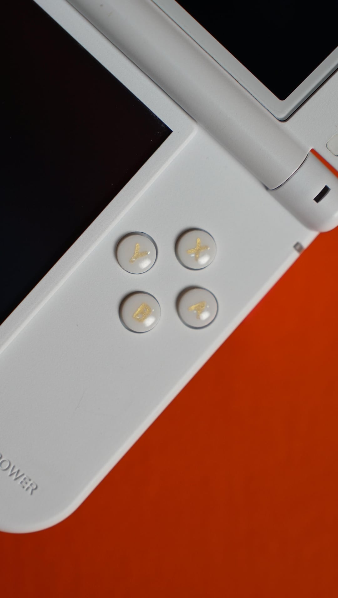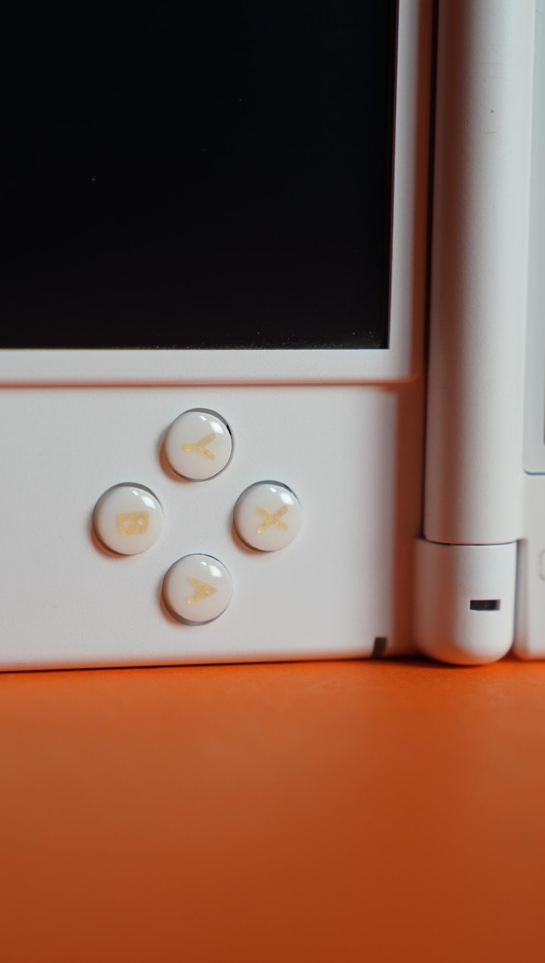 Custom designed and flat style of D-pad in gold paired with white × gold ABXY buttons on a white Nintendo 3DS XL.