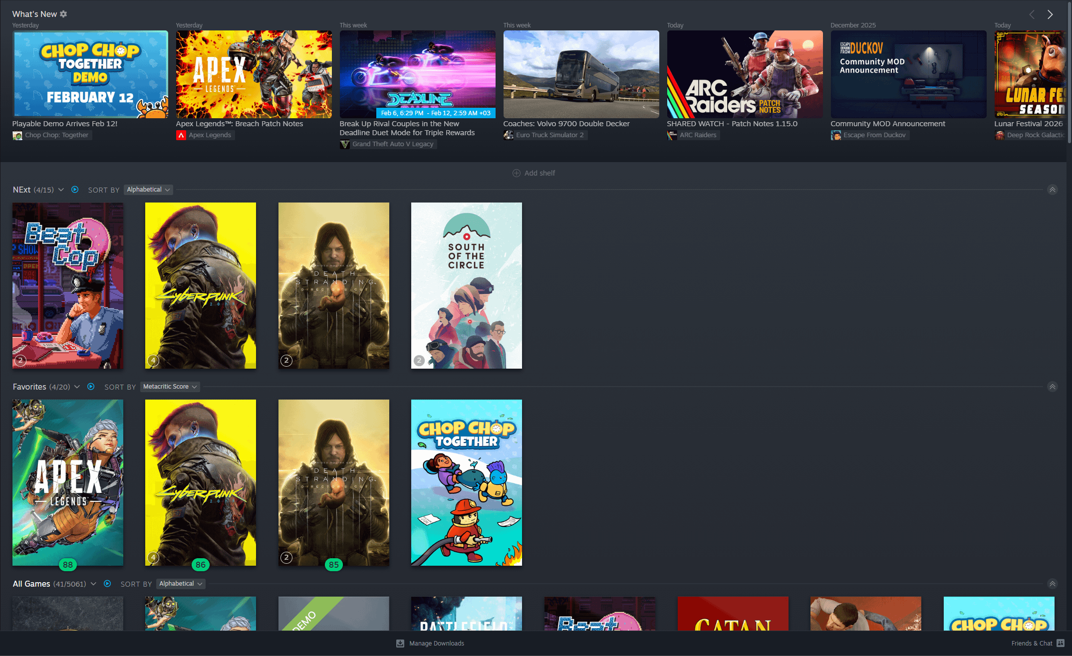 1. I only have 175 games. I focused hard on my backlog last year. Here are my categories: multiplayer, DNR (for games that don’t run on modern pcs), Not my cup of tea (games that I have tried but cannot get into but might visit again), completed-2025, completed-2026, completed (?-2024), Rotation (games I am working on now – limit 3) and then all uncategorized (this is my backlog)