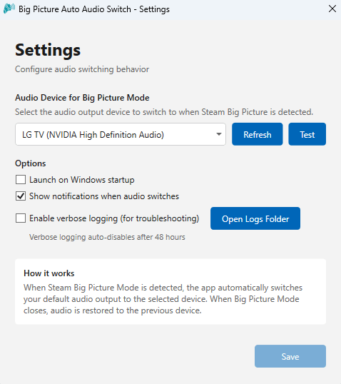 It sits in the system tray and detects when Big Picture opens. It automatically switches your default audio to your TV (or whatever device you pick), and switches it back to your PC speakers/headphones when you close it.