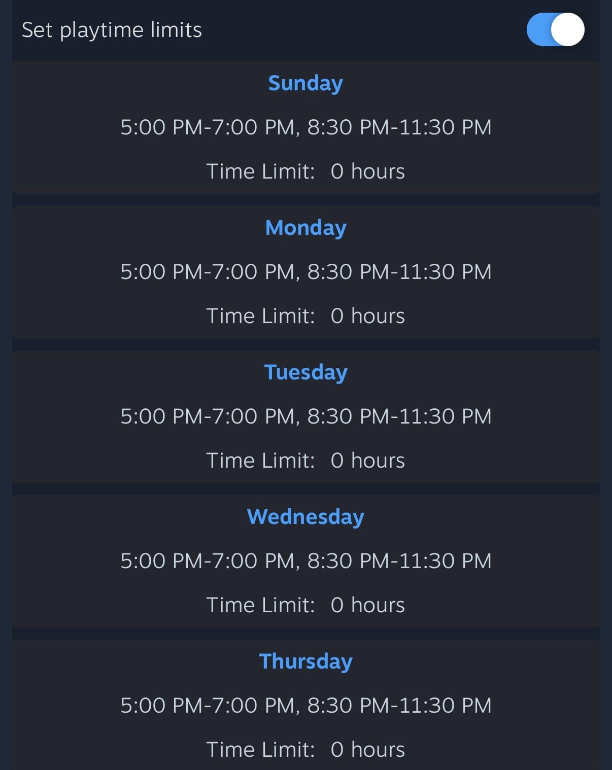 Parent trying to block out time for my kiddo from 5-7pm on school nights for homework time and then again after 8:30pm for bedtime. However, steam still blocks out time after 7pm…like 7:30 even. I have to disable parental controls altogether to get it working again. What am I doing wrong?