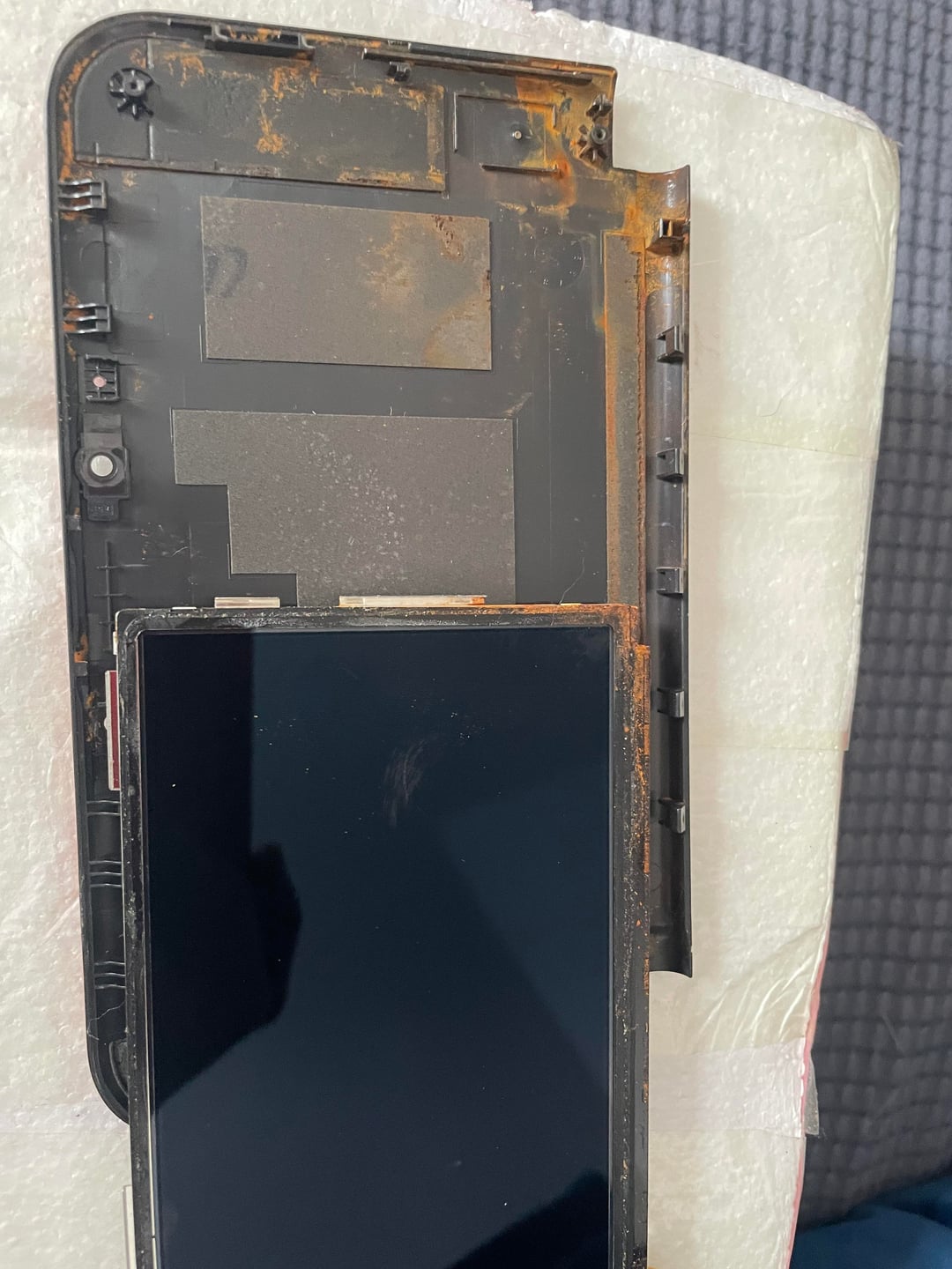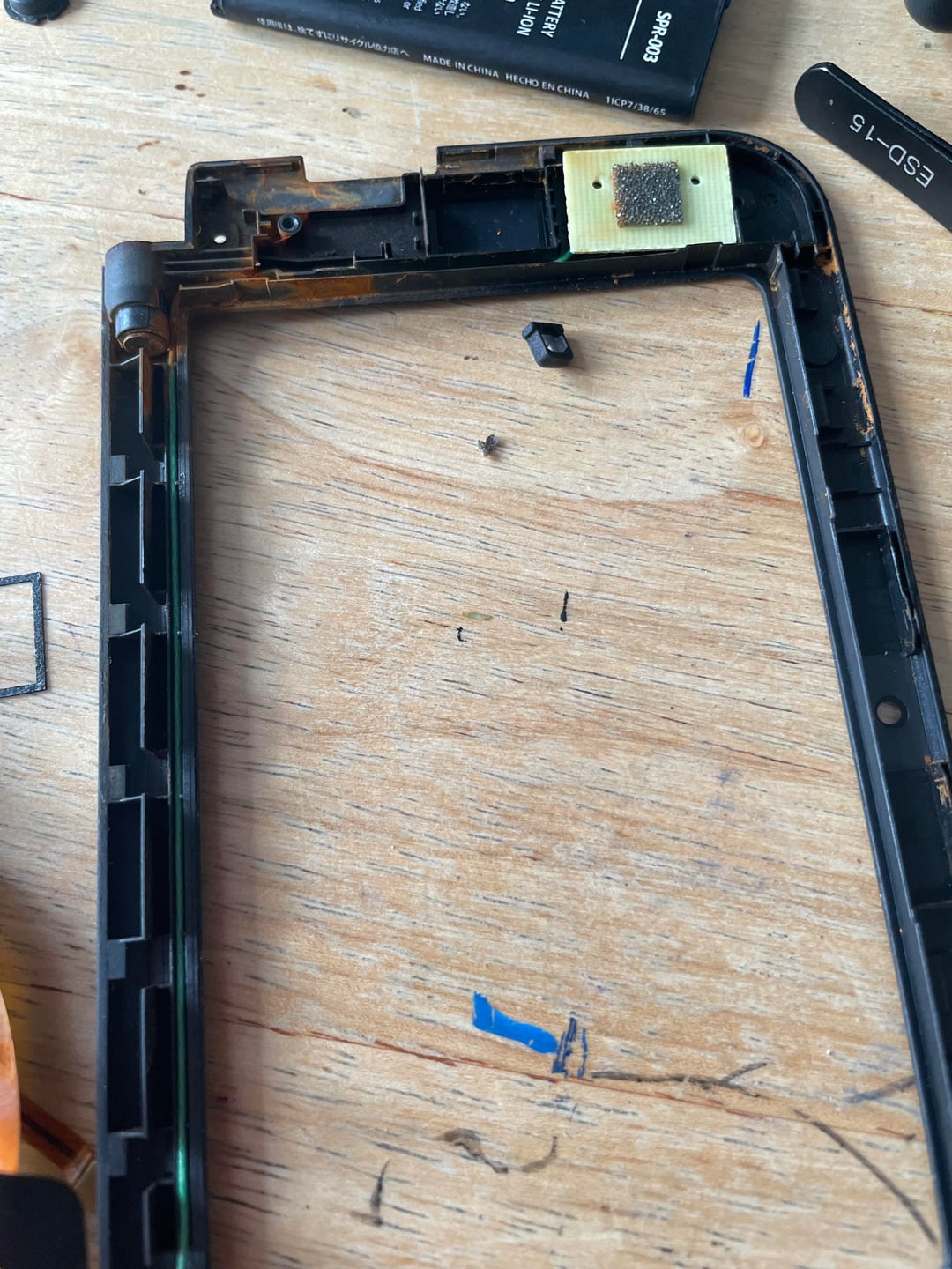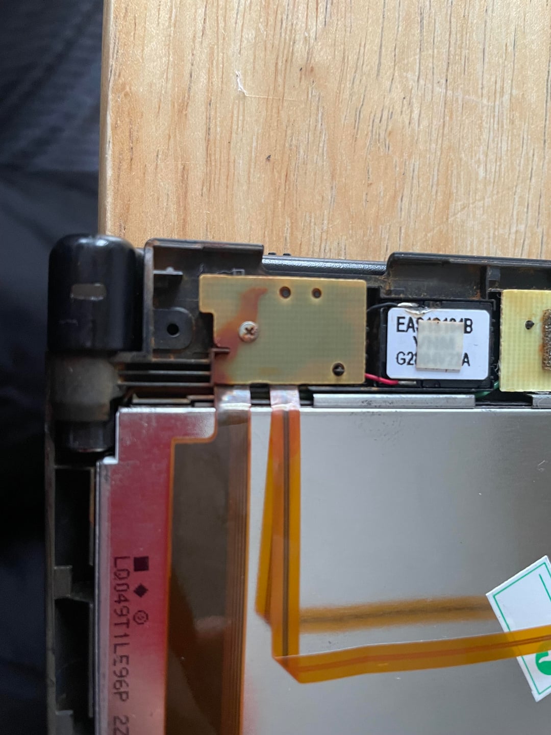 We began with a full disassembly to assess internal damage. The upper assembly showed significant corrosion along the hinge channel and speaker bay. The right speaker wiring required careful desoldering and re-seating. Ribbon cables were inspected.